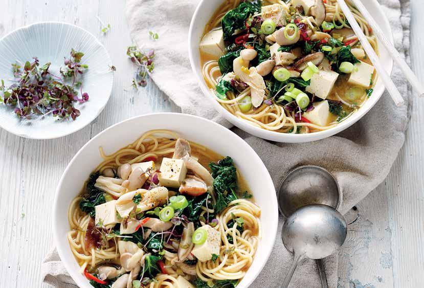 STEP 3 Add mushrooms, kale and tofu. Cover and simmer for 2- 3 minutes until kale wilts and mushrooms are just tender. Divide noodles among 4 serving bowls. Ladle broth mixture over noodles. Top with extra sliced green onions and micro-herbs (if using) and serve. COOKING 10 MINS PREP 15 MINS SERVES 4