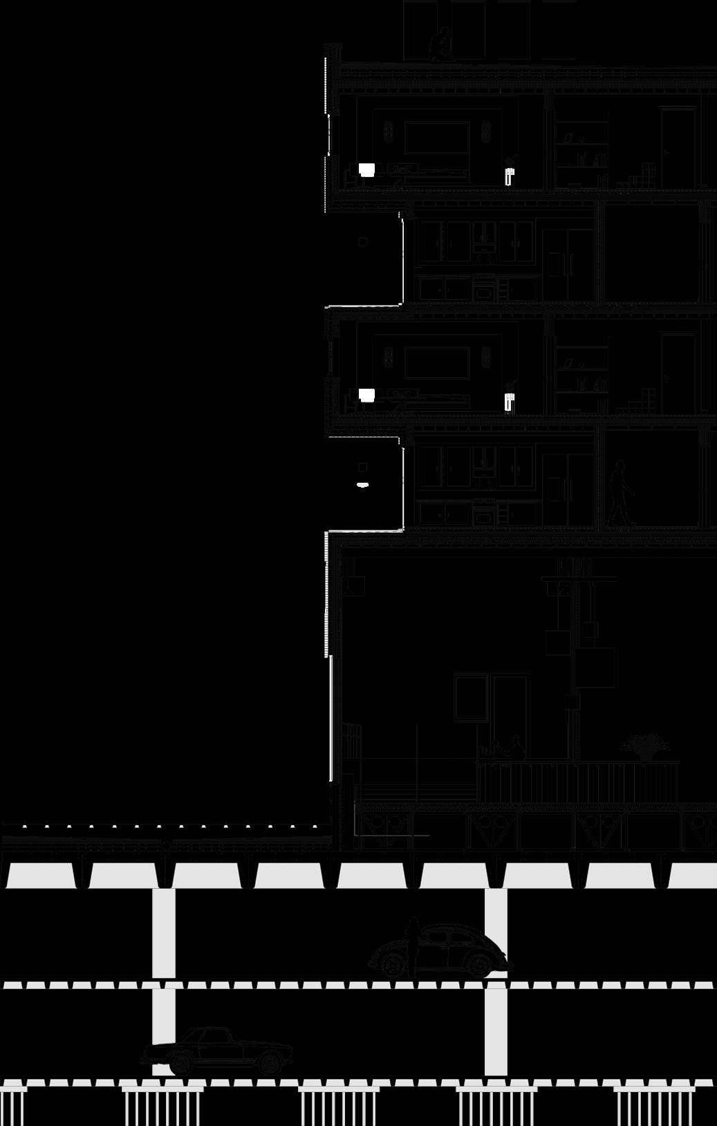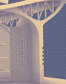 is animated by a brew pub, gaming café, and incubator kitchens, fostering engagement and economic opportunity while blurring the boundary bet ween public and private realms. Above, the residential component introduces skip-stop duplex units that ensure cross-ventilation, privacy, and af fordability Inspired by Le Corbusier’s Unité d’Habitation, these units prioritize multi-generational living, of fering three and four -bedroom families, and growing immigrant community The elevated