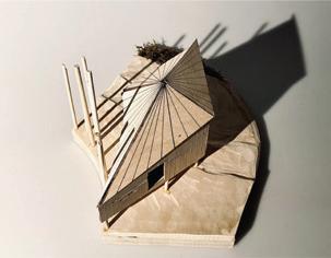 Constructed from dimensional lumber, the Ice -hut took the form of a large arch which looped overhead, and was strategically of fset in plan to touch the ground at a dif ferent plane. It was originally designed to emerge from the ice, loop overhead, pierce the ice, continue underground as if anchored,and then emerge once again from the ice; completing one full cycle, and stopping about one -third of the next cycle -picture the coils of a spring. As the conversations progressed, our team of 15 architecture students decided on a singular loop, completing just one cycle. I remember observing on one of our earlier visits to the site, before the lake completely froze up in the winter; this vast expanse of fresh-