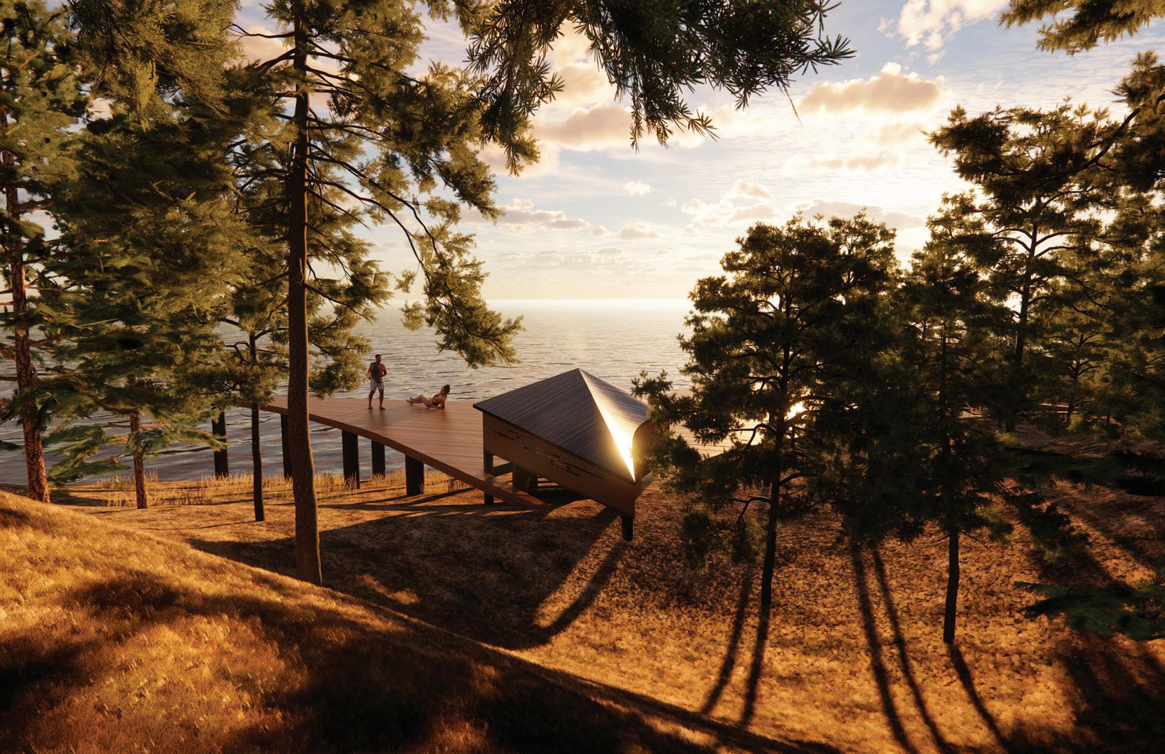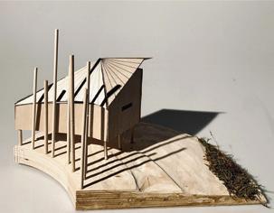 ‘Anchored’ provides a Sauna solution to one of the most delicate, yet accommodating terrains around Bennet Lake The overarching concept is birthed from the site path leading to the lake, before looping into he recreation centre. The key programmatic elements are tangentially anchored at opposite ends of the path, following the movement of the sun The spaces shape into an asymmetrical t win structure, with the space closest to the primary site access becoming the public space, while the neighbouring structure is reserved for the more private sauna and changing rooms. The t win spaces are aligned to purposefully frame the lake ahead, with the path serving a dual purpose of wreathing the arrival threshold.