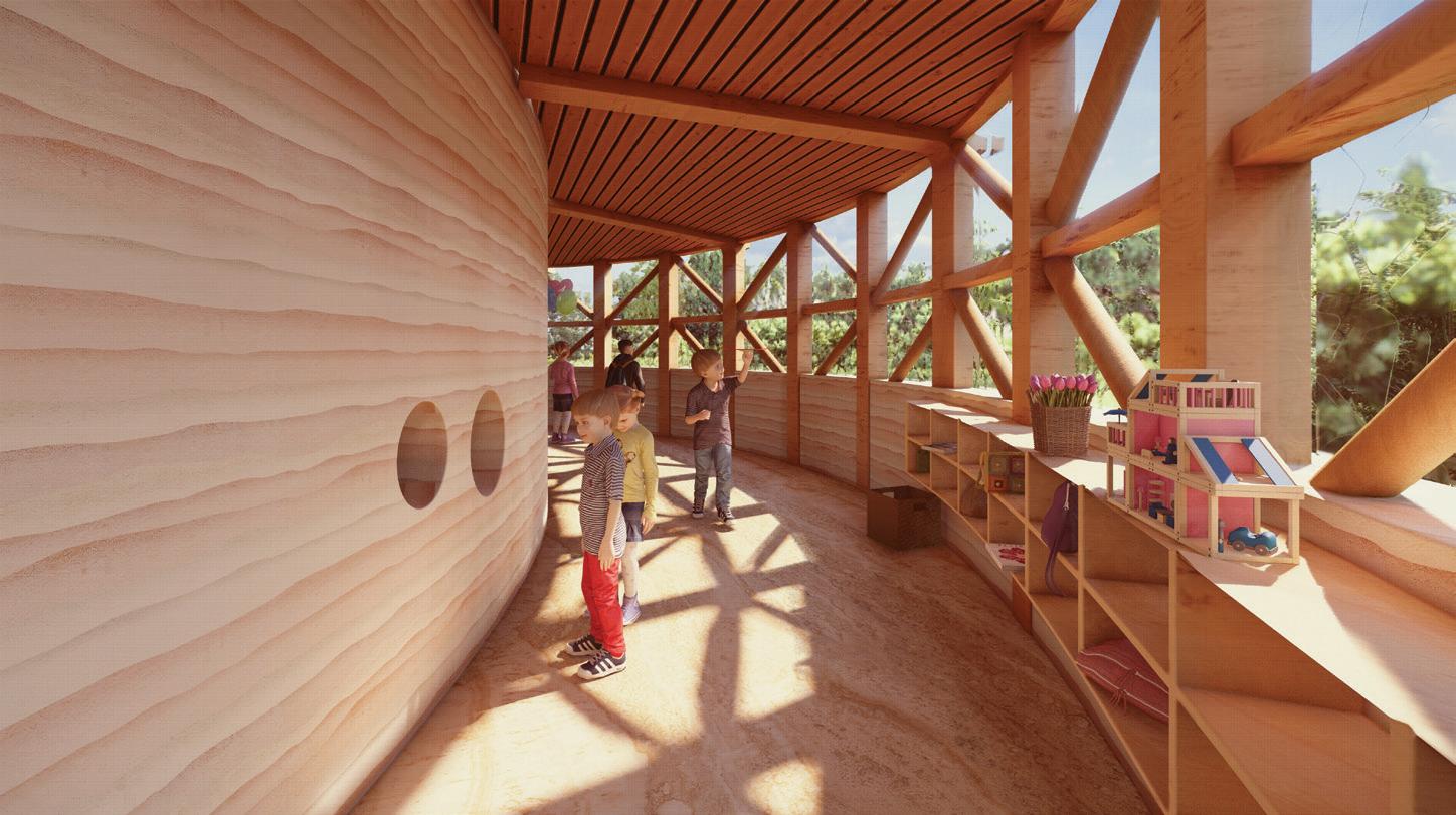 The Moulin-a-Fleur Kindergarten proposes a design that s eamlessly integrates the existing playground with the school premises, acting as a bridge b et ween education and r ecreation The design pays h omage t o the renowned F lour m ill, o nce s lated for destruction, b y preserving its e ssence a nd r eimagining i t into a new learning hub