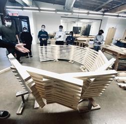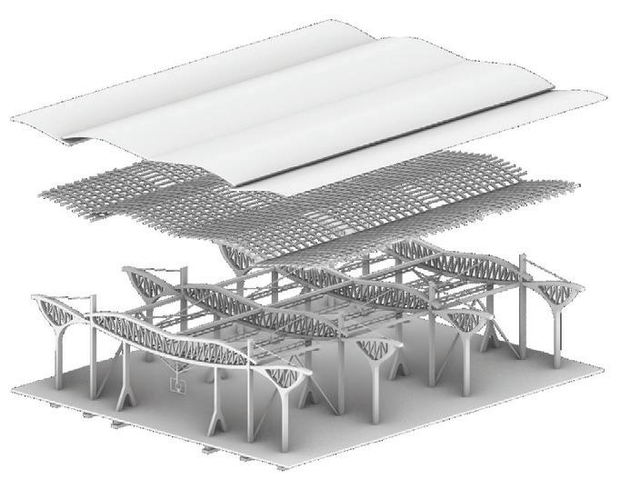 carves out dif ferent pockets for a variety of comfortable seating experiences. Near the midpoint, the west end opens into a sheltered seat, while the form subtly caves in behind it to accommodate those who want to lean. Moving along, the unsheltered section becomes a “lounge zone,” where people can sit or stretch out along the curvature of the bench. As the bench begins to rise again toward he east end, the top of the sheltered panels doubles as a backrest for those lounging