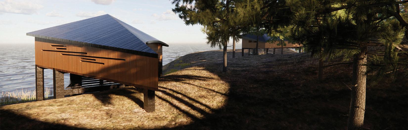 In thinking about Architecture and its qualitative possibilities, one is often invited to recall the natural order; the natural rhythm of life -to derive answers from all that have stood the test of time. ‘Anchored’ provides a Sauna solution to one of the most delicate, yet accommodating terrains around Bennett Lake. The overarching concept is birthed from the site path leading to the lake, before looping into the recreation centre. The key programmatic elements are tangentially anchored at opposite ends of the path, following the movement of the sun. The spaces shape into an asymmetrical twin structure, with the space closest to the primary site access becoming the public space, while the neighbouring structure is reserved for the more private sauna and changing rooms. The twin spaces are aligned to purposefully frame the lake ahead, with the path serving a dual purpose of wreathing the arrival threshold.