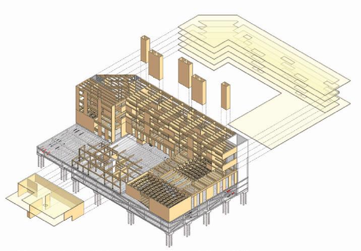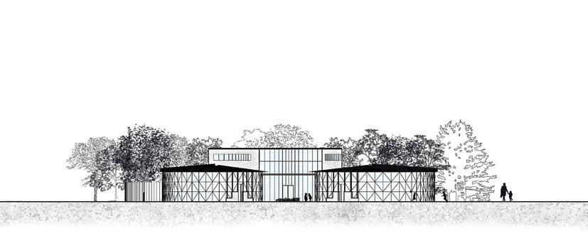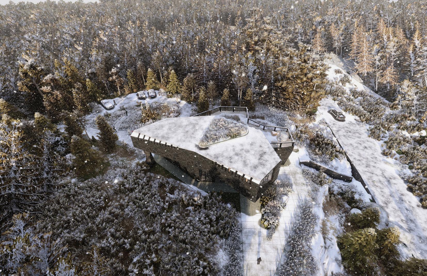 The timber framing and Gabbro veneer which accounts for majority o the building structure and volume, can be returned to he forest a the end of the building life-cycle, contributing to the sustainability goals of the design. The roofs of both levels feature an elevated Urban garden, housing tens of local species, ncluding blueberries; while the topmost roof is retrofitted with retention boards to hold and redirect mass stormwater into a filtration and storage ank below the deck. This water is then pumped into the building o satisfy all its sanitary needs. These simple design gestures create a language o sustainable use and reuse, greatly reducing the carbon footprint of the ecology centre.