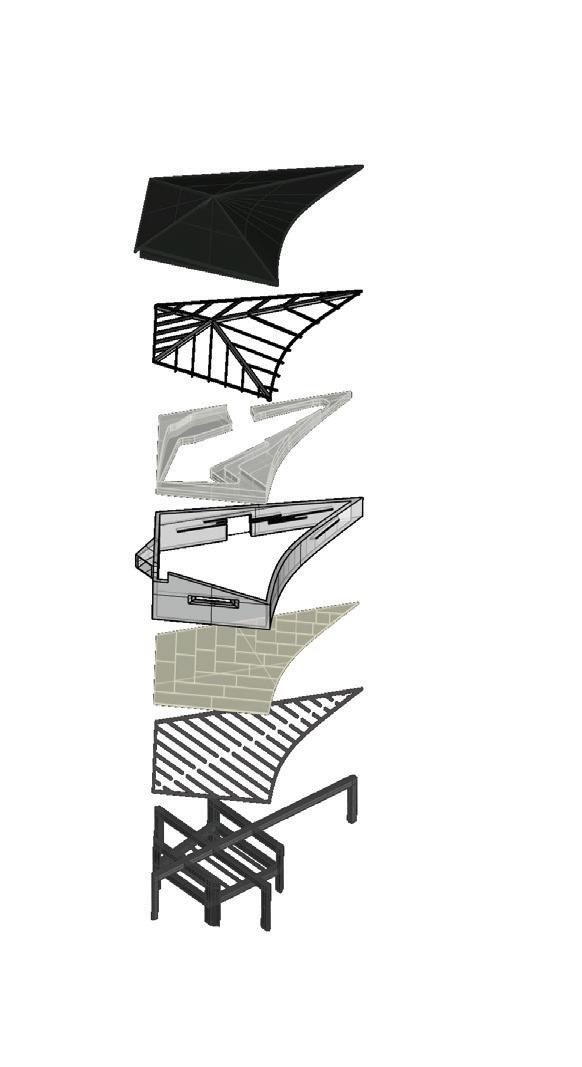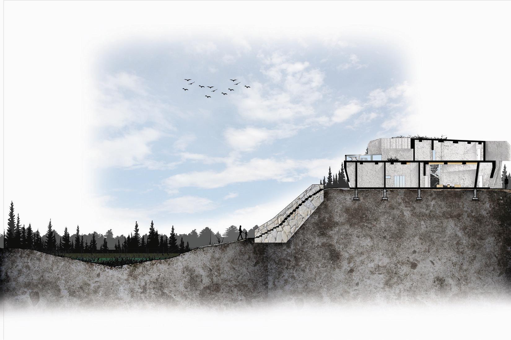 In erms o materiality, the boulder form is framed with Glulam columns and beams, anchored to the bedrock via concrete piers and footings. Glued laminated timber offers enough lightness and rigidity to both frame and span the cantilevered beams supporting the second level. Steel is introduced minimally o bolt the column/beam/bracing connections. The exterior cladding of natural Black Nephrite veneer s blended with the cladding of the nterior walls, blurring he distinction between the outdoor and indoor, while the flooring and stairwell assembly are clad with Gabbro creating a unique contrast n the nterior. The Precambrian Nephrite cladding contrasts with he ocal geology, simulating a oreign rock presence embedded onto the site, after years of glacial transportation and abrasion. This selection of materials allows for a careful disassembly of building sections to either repurpose the space, or recycle the building materials.