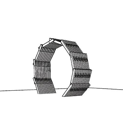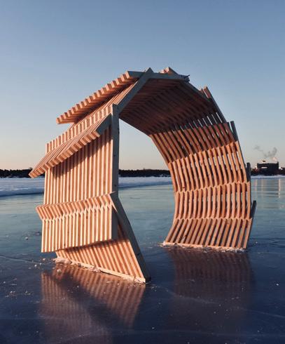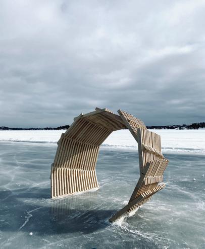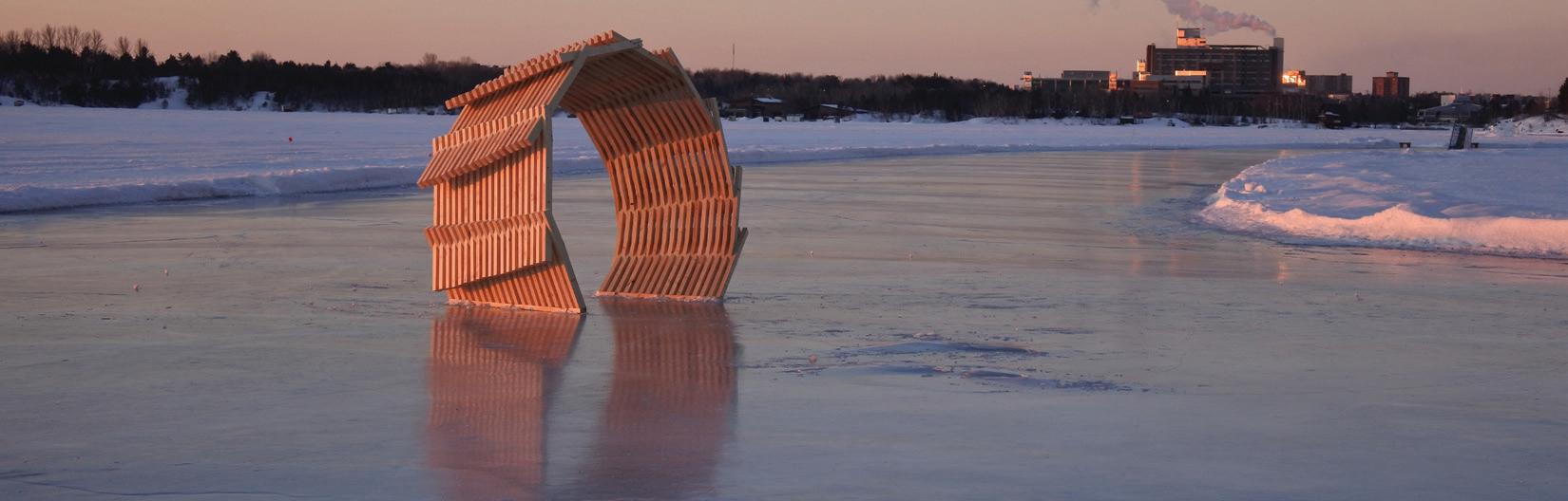 Constructed from dimensional lumber, the Ice-hut took the form of a large arch which looped overhead, and was strategically offset in plan to touch the ground at a different plane. It was originally designed to emerge from the ice, loop overhead, pierce the ice, continue underground as if anchored, and then emerge once again from the ice; completing one full cycle, and stopping about one-third of the next cycle -picture the coils of a spring. As the conversations progressed, our team of 15 architecture students decided on a singular loop, completing just one cycle. I remember observing on one of our earlier visits to the site, before the lake completely froze up in the winter; this vast expanse of freshwater filled with flocks of ducks, geese, and the horizon not too far ahead. Just past the lake, where the horizon began, we could see the campus. The lake felt alive.