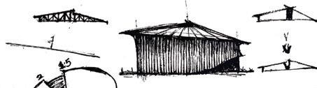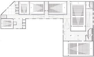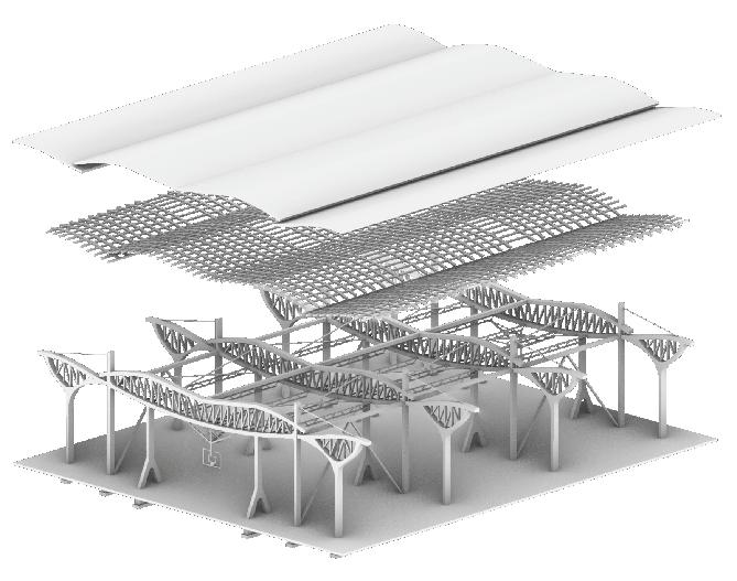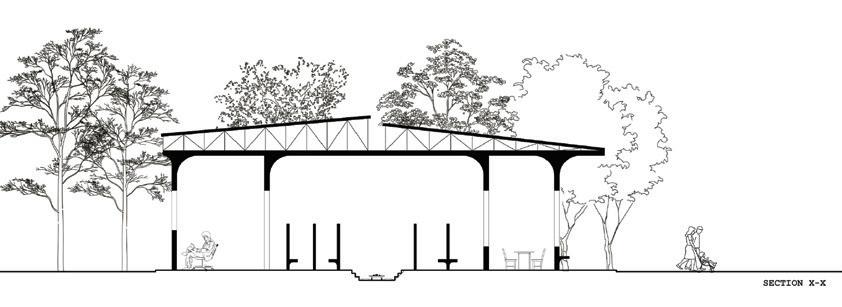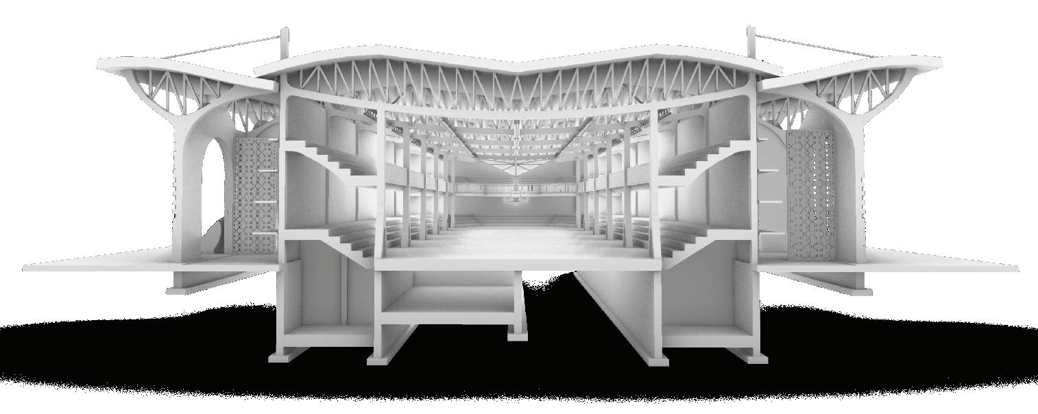 The main hall is designed to be more sports focusedspecifically basketball. A key design feature is the idea to mount the basketball hoop system onto the secondary trusses of the actual building assembly, integrating the standard hoop height of 10ft into the building design. On the 2nd floor, is a restaurant accessible through an elevator on the right wing. It is secluded from the rest of the building, and facing the street, so visitors can enjoy the changing cityscape, as they eat. On the left wing of the second floor, is the music/ performing arts hall. The walls and ceiling of this space is padded with sound panels, to reflect all the sound waves produced in this space, enhance the reverberation, and improve the overall listening experience. Below grade, is an included fitness center/changing rooms for guests during big sporting events, and on the right, is storage for all the equipment that would need to be tucked away as the space is adapted for various uses. In between the two roof planes of the main hall, and the market stalls, are operable clerestory windows, which open up channels for rising warm air to escape and allow for cross ventilation.
