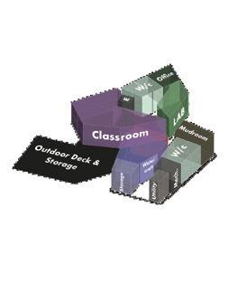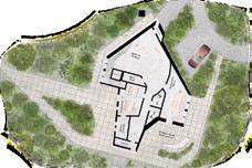 On the other side of the building, the deck opens up once again, creating an outdoor workstation where Kayaks can be temporarily stored and epaired. The deck extends from he workstation towards he parking, o allow for ease o watercraft transport. An exterior stair intervention is introduced onto the hill supporting the main building volumes, connecting the Nasa Observatory to the site below. The former access road is transformed into a narrow pathway leading to the play area, Kayak Storage and Dock. The existing trails cut across, connecting the other half of he site, while the excess land area is re-greened with Jack Pine White Pine Spruce and Fir trees.