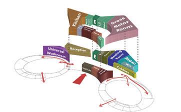 A tiered theater arrangement supports a variety of cinematic experiences, from large-scale event spaces to intimate screening rooms, accommodating everything from festivals and corporate rentals to independent films. At the ground level, the streetscape is animated by a brew pub, gaming café, and incubator kitchens, fostering engagement and economic opportunity while blurring the boundary between public and private realms. Above, the residential component introduces skip-stop duplex units that ensure cross-ventilation, privacy, and affordability. Inspired by Le Corbusier’s Unité d’Habitation, these units prioritize multi-generational living, offering three and four-bedroom layouts specifically designed to accommodate Sudbury’s young families, and growing immigrant community. The elevated cinema volumes preserve a flexible plaza below, an adaptable urban void that encourages public gatherings, pop-up markets, and spontaneous interactions, reinforcing the site’s role as a cultural and social anchor within the city.