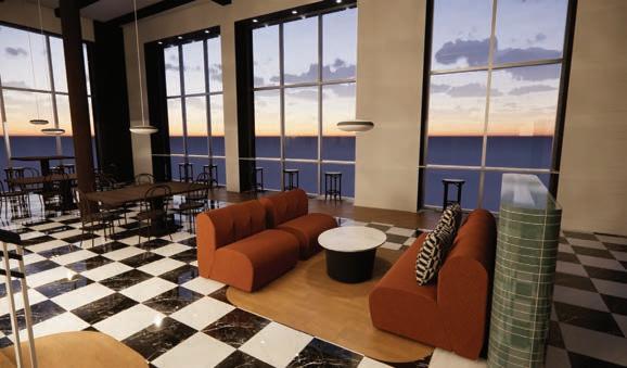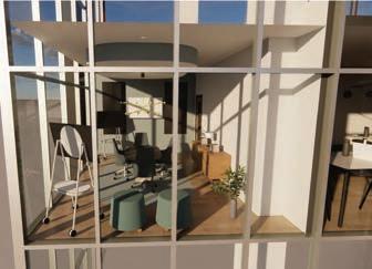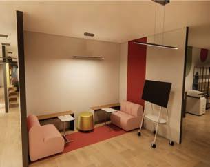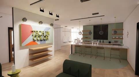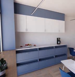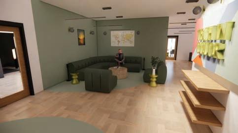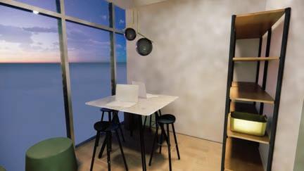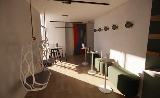 THIS WORK STATION AREA IS AN EXTENSION TO THE RIGHT OF THE STAFF BAR COFFEE SPACE. IT IS OPEN SO THE STAFF CAN FEEL OPEN TO SOCIALIZE WHILE ALSO WORKING COLLABORATIVELY. THE HANGING CHAIRS ON THE LEFT WALL IN THE RENDERING ARE BOTH COMFORTABLE AND SAFE FOR ANYONE.