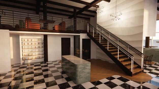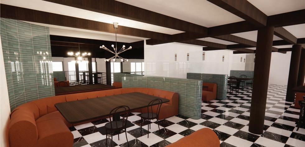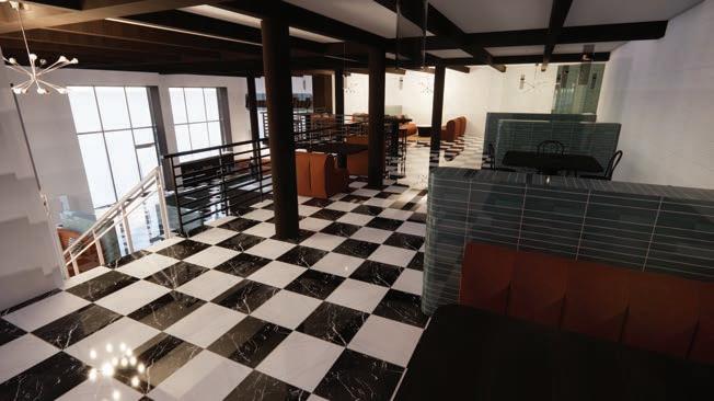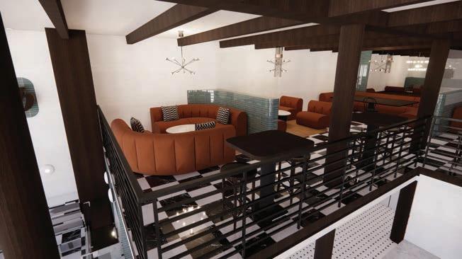 be a more secluded and private wall there is two lounge spaces dining area. In the back left corner for a large party of people. The group of buisiness people getting back wall there are two booth tables enclosed space of the mezzanine comfortable for customers to chill or themselves.