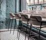 The bathroom consists of one ADA stall and two regular stalls. The materials from the rest of the restaurant are continued into the bathrooms.