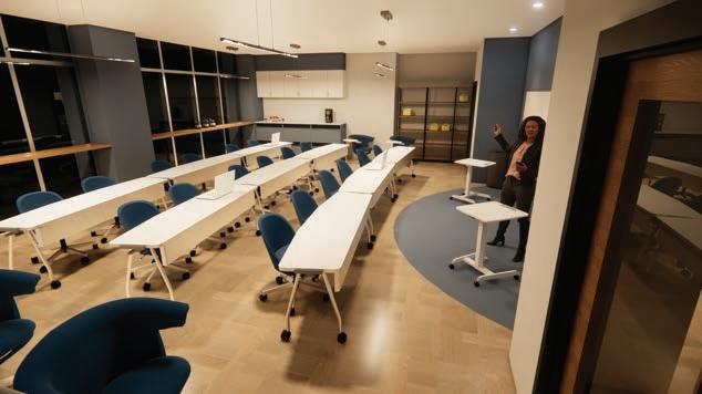 OAK WOOD THE TRAINING ROOM CONSITS OF MOVABLE TABLES AND CHAIRS THAT CAN ACCOMIDATE ANY TYPE OF TRAINING SET UP. IN THE FAR RIGHT CORNER IS A SERVICE STATION WITH PLENTY OF STORAGE. THE BACK WALL WITH FLOOR TO CEILING WINDOWS HAS A STANDING BAR SHELF FOR SOCIAL TRAINING SETTINGS. STAGGER 72 LINEAR LIGHT BY TECHLIGHTING