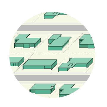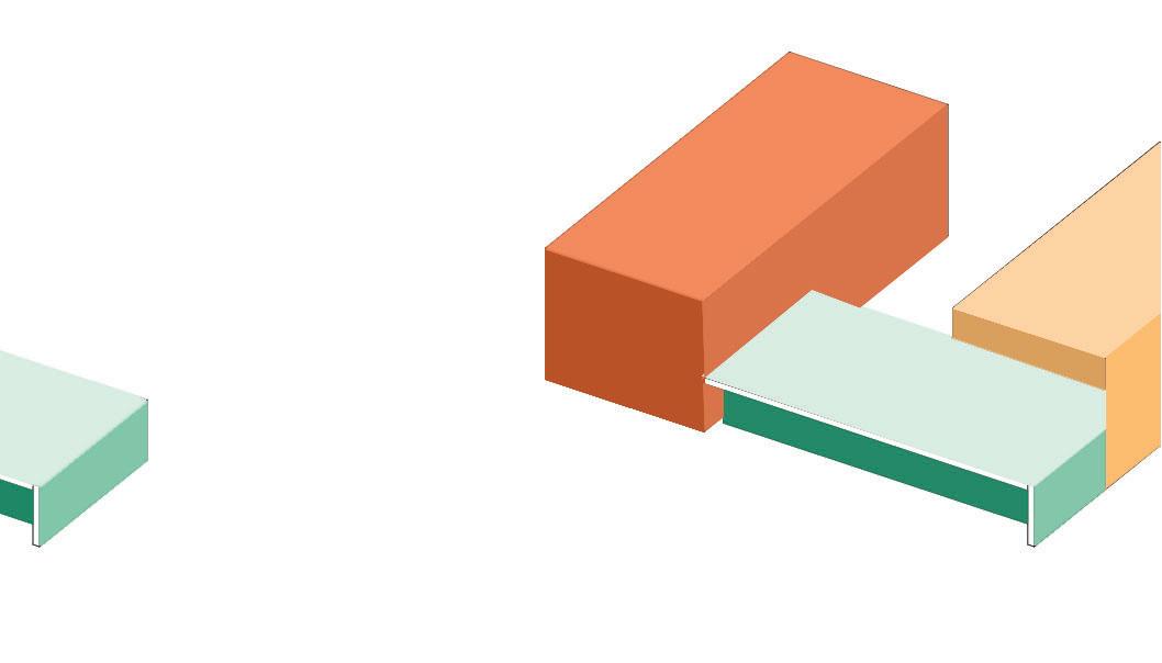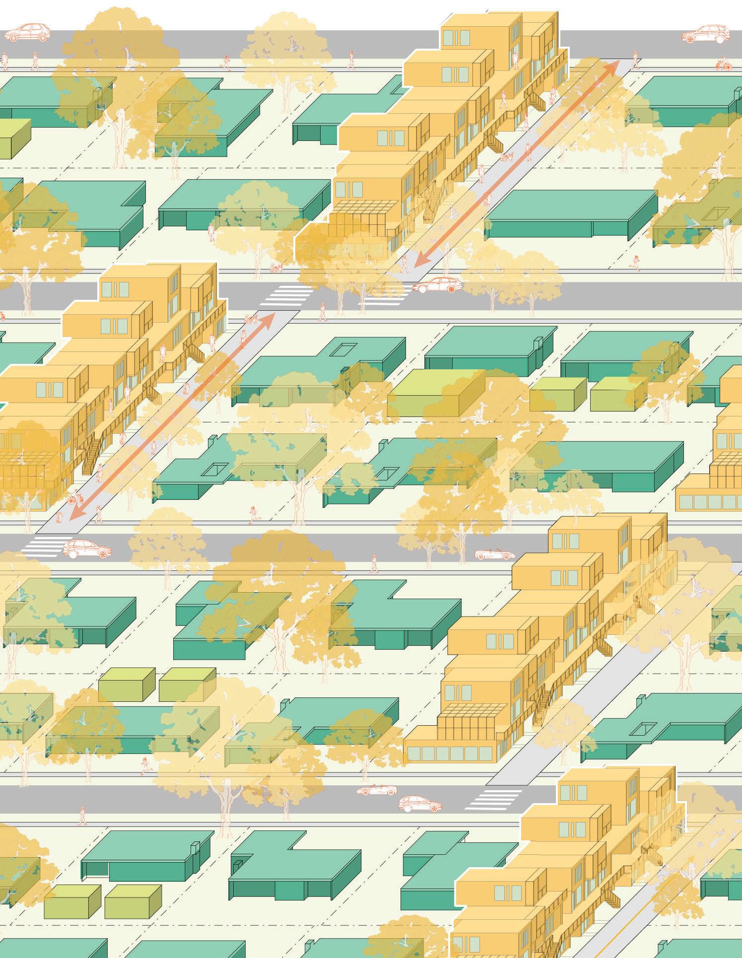 By offsetting the position of the units to one side of the lot, a large walkway is created for pedestrian use. This creates a new grain to a neighborhood whose circulation is primarily vehicular that runs parallel to lots.