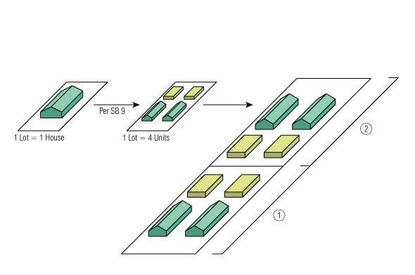 Per California government policy Senate Bill 9, one single-family home lot can be divided into 2 separate lots, each with an ADU.