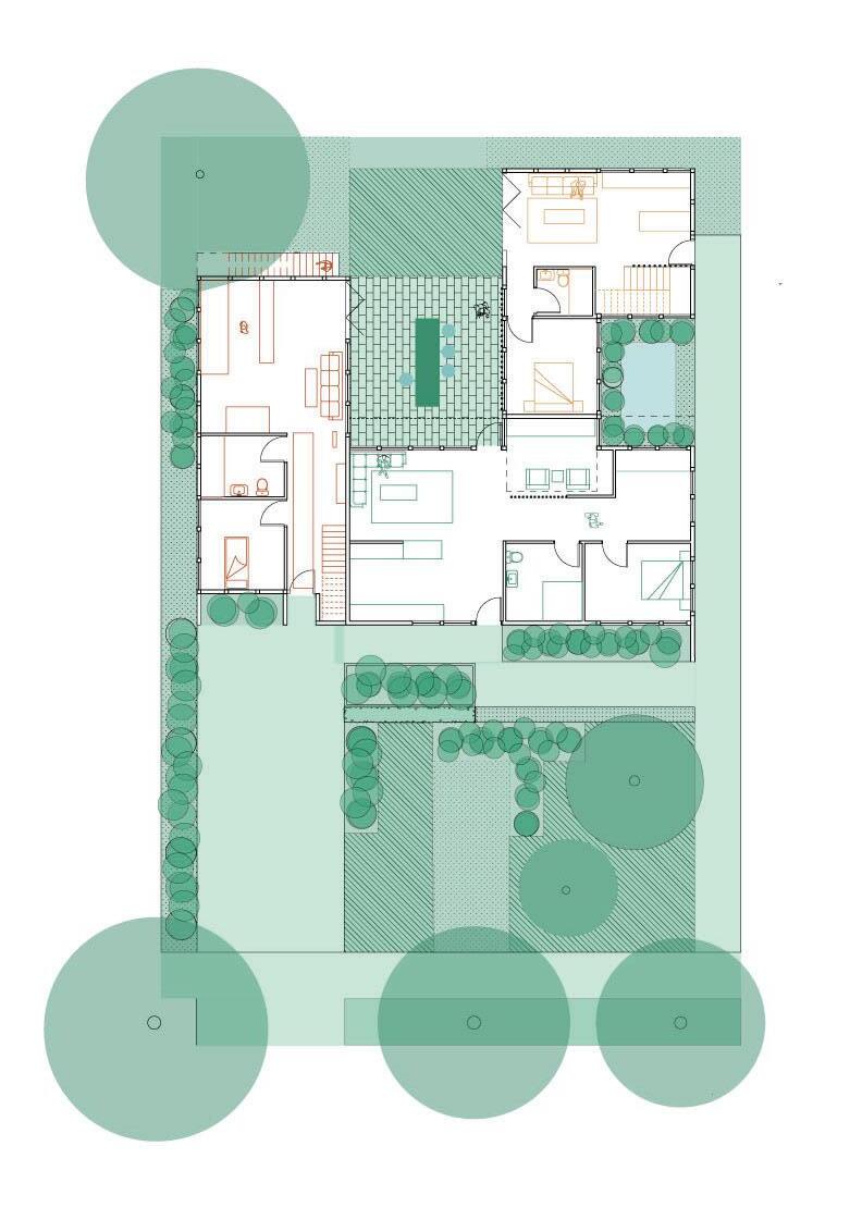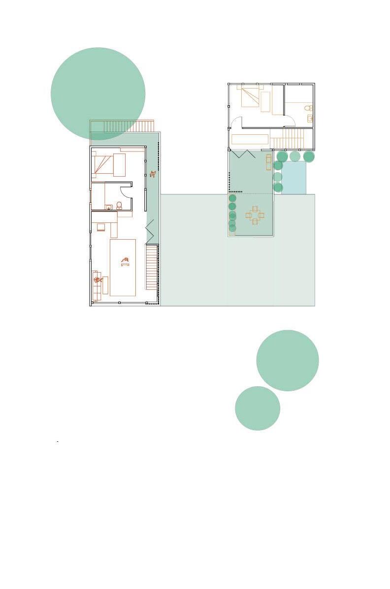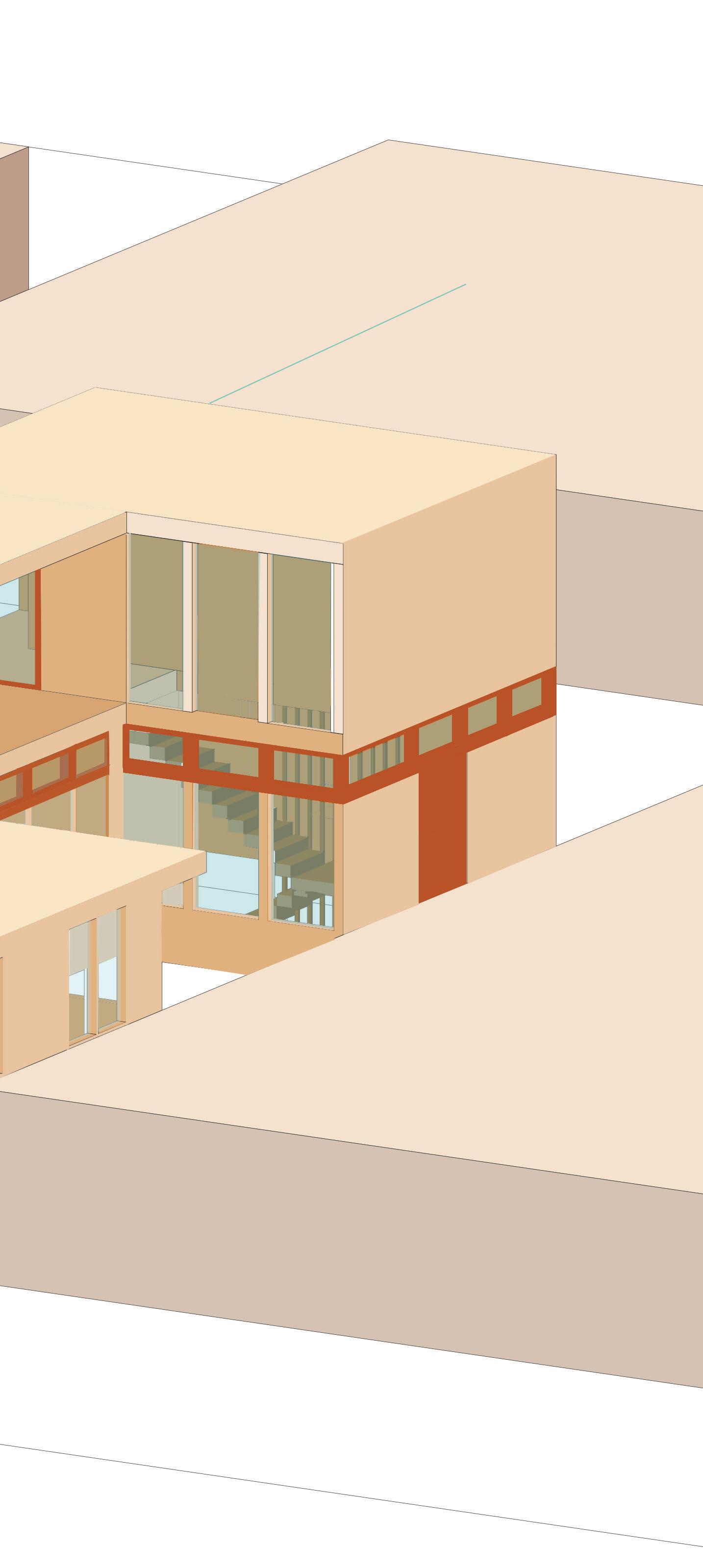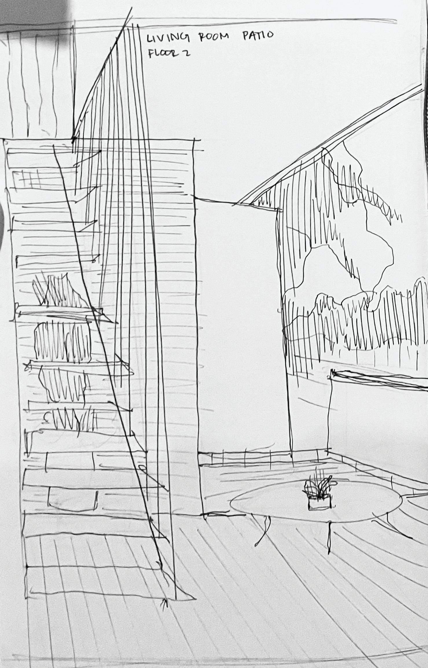To achieve a harmonious aesthetic, I incorporated flat roofing systems, drawing inspiration from Ain’s work. Additionally, I emulated the shell-like casing present in the left unit by crafting a niche for plantings and outdoor seating, and integrated trellis work reminiscent of Ain’s signature designs. To distinguish between the original and the new elements, I strategically employed a section approach, introducing a band of ribbon windows that not only elevated the ceiling height but also facilitated a seamless and unifying transition between the units.
