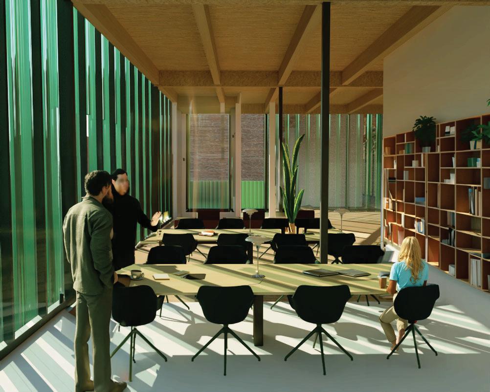 Set in Hell’s Kitchen in New York City, this occupiable school mockup is a design driven by its thermal and luminous qualities created by a two-layer facade system: a glass curtain wall and glazed terracotta rainscreen. Through iterative processes involving facade design and the use of Climate Studio, the project achieves maximum efficiency in its thermal and luminous qualities that creates a plethora of different lighting and heating conditions to provide for enhanced personal experience. The program also calls for different lighting and heating conditions. The building consists of desking areas, meeting rooms, social spaces, a reading room, a rare botanical book collection, and a tropical plant greenhouse