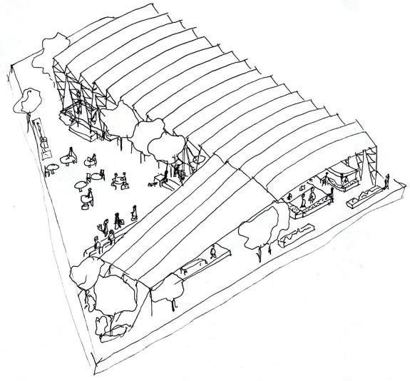 In my final project of the semester, I transformed my innovative roof design into a community-centric outdoor market in Chicago. The adaptable roof structure was tailored for engaging with the community, featuring purposeful market stalls and an outdoor performance space. Inspired by an airplane hangar, the design seamlessly integrated into the urban fabric, with carefully crafted trusses serving both functional and aesthetic purposes. Prioritizing functionality and unity, the market stalls were designed for local vendors. The additional outdoor space enhanced cultural vibrancy, hosting community events. This project exemplifies my commitment to pushing architectural boundaries for real-world challenges, show-