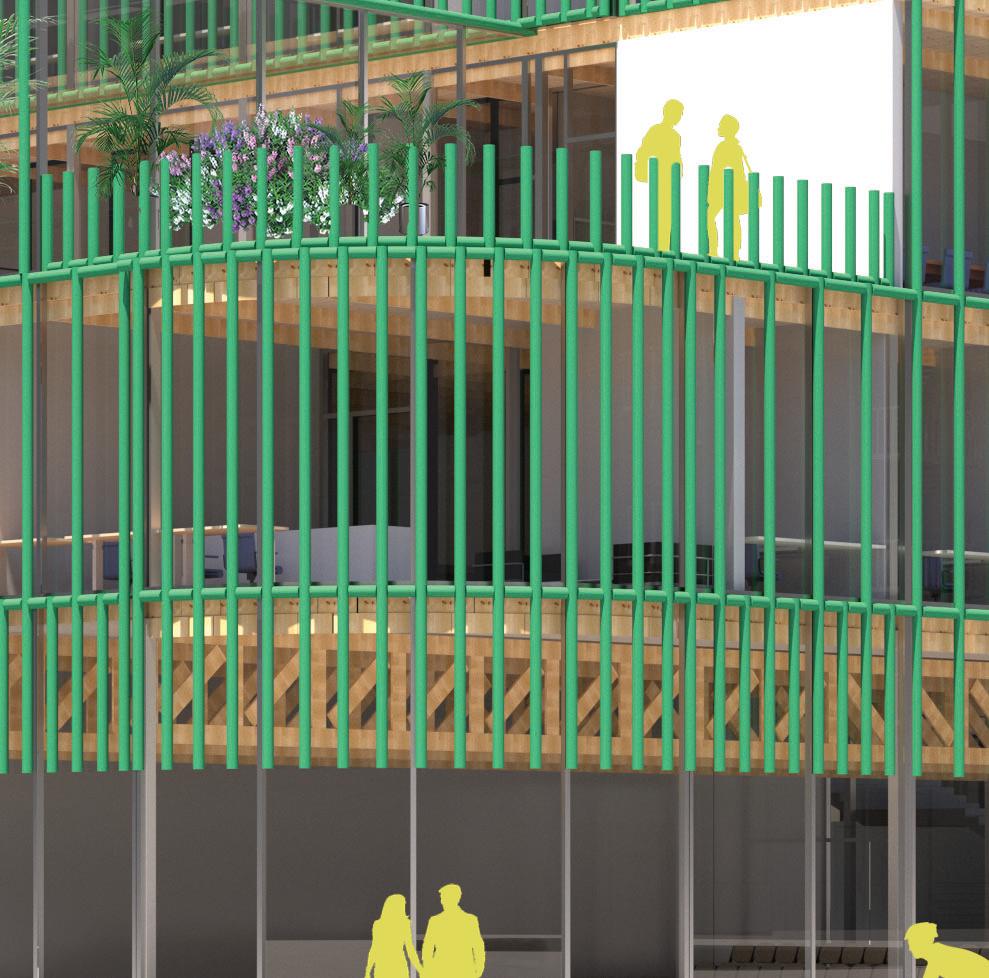 The project employs a cross-laminated timber (CLT) structural system to reduce embodied carbon, complemented by terracotta louvered rain screens inspired by Manhattan’s Art Deco aesthetic. These louvers optimize daylighting, mitigate glare, and enhance thermal comfort, leveraging advanced simulations through Climate Studio to achieve precise environmental performance.