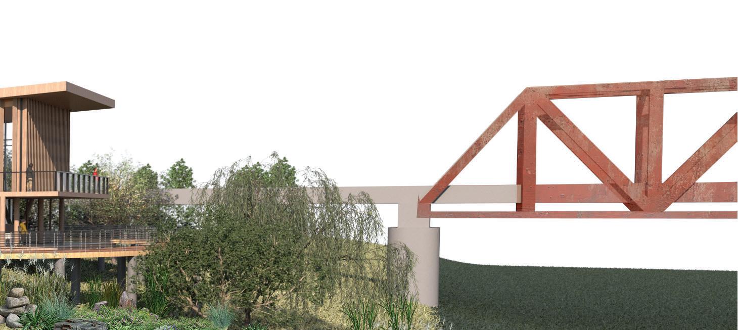 Focused on systems integration and holistic design processes to reconnect North Little Rock with nature while introducing new community spaces. The project utilizes a mass timber framing system with glulam V-shaped exterior columns and a 5-layer CLT flooring and roofing system, emphasizing sustainability and structural elegance. Situated in a 100-year floodplain, the design integrates a retaining wall and strategically placed landscaping elements, including bioswales and swamp gardens, to manage rainwater and mitigate rising water levels of the Arkansas River to the south. These systems work in harmony to create a narrative-driven design that fosters environmental connection and enriches public engagement with the site