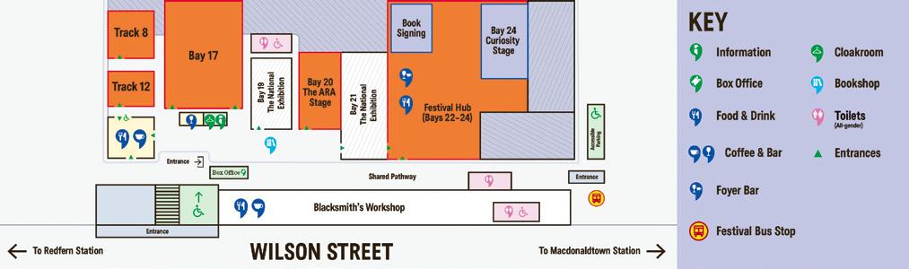 It’s not just your minds that are in for some serious nourishment this Festival Week. The Festival Precinct has everything you need to make your 2023 Sydney Writers’ Festival an enriching all-day event. Start your morning off by picking up a fresh brew and popping along to Coffee and Headlines (page 9), a free event where leading journalists discuss the news of the day. Between sessions, you’ll also have an opportunity to browse our bookshop in the Carriageworks foyer, grab a bite to eat from the Festival Hub in Bay 22, or explore the food trucks, coffee carts and wine bars located throughout the Precinct. Joining us for our food program on Saturday 27 May? Pop in to peruse fresh produce at the Carriageworks Farmers Market which coincides with the Festival.
