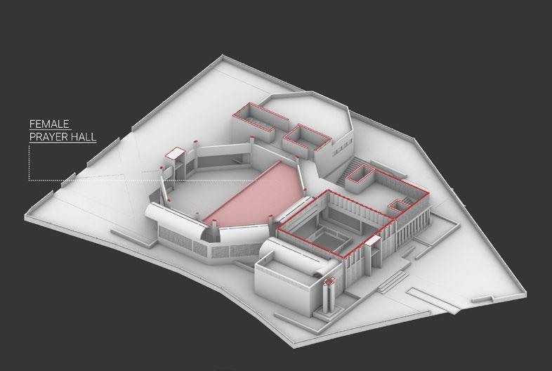 with ample natural light and ventilation. The women’s prayer hall is placed in a prime location, ensuring easy access and a quiet, entrances, are integrated into the design to ensure a secure environment for all users.