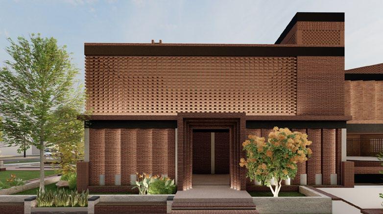 The key design feature of the mosque is its striking red brick Jaali (lattice) work, which plays a pivotal role in both the aesthetics and environmental comfort of the building. maintaining privacy and cooling the internal spaces. The modularity of the brickwork follows varying rhythmic, geometric patterns that enhance the architectural coherence with the brick module, creating a unified and harmonious design language.