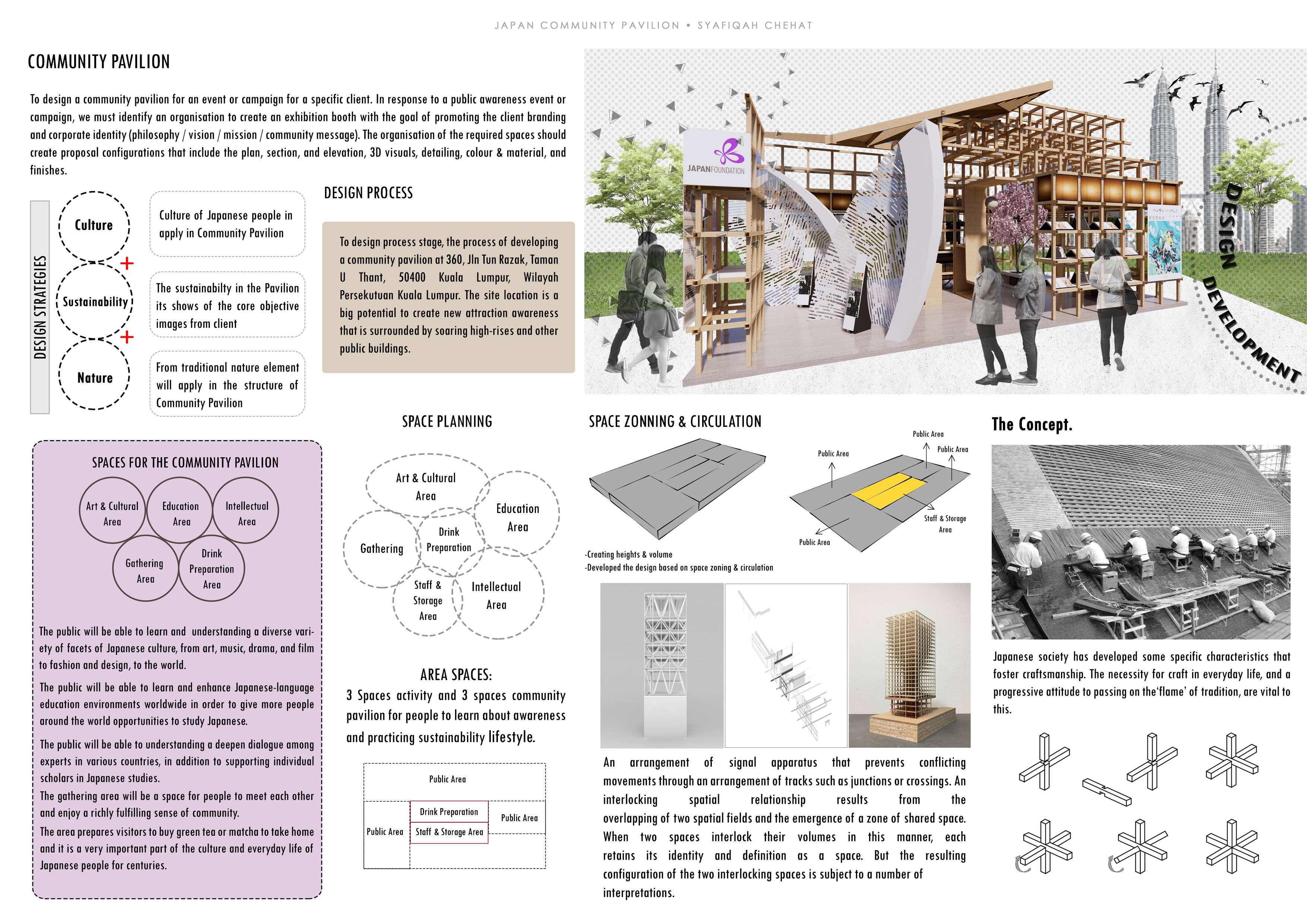In addition, this project offering of learning, exposure, and leisure to the visitor and participants. Two types of classes are provided which are origami class and calligraphy class Through this space and activities, knowledge will be gained. This project also includes an exhibition events space, a Japanese restaurant and a retail floor filled with highly curated Japanese products