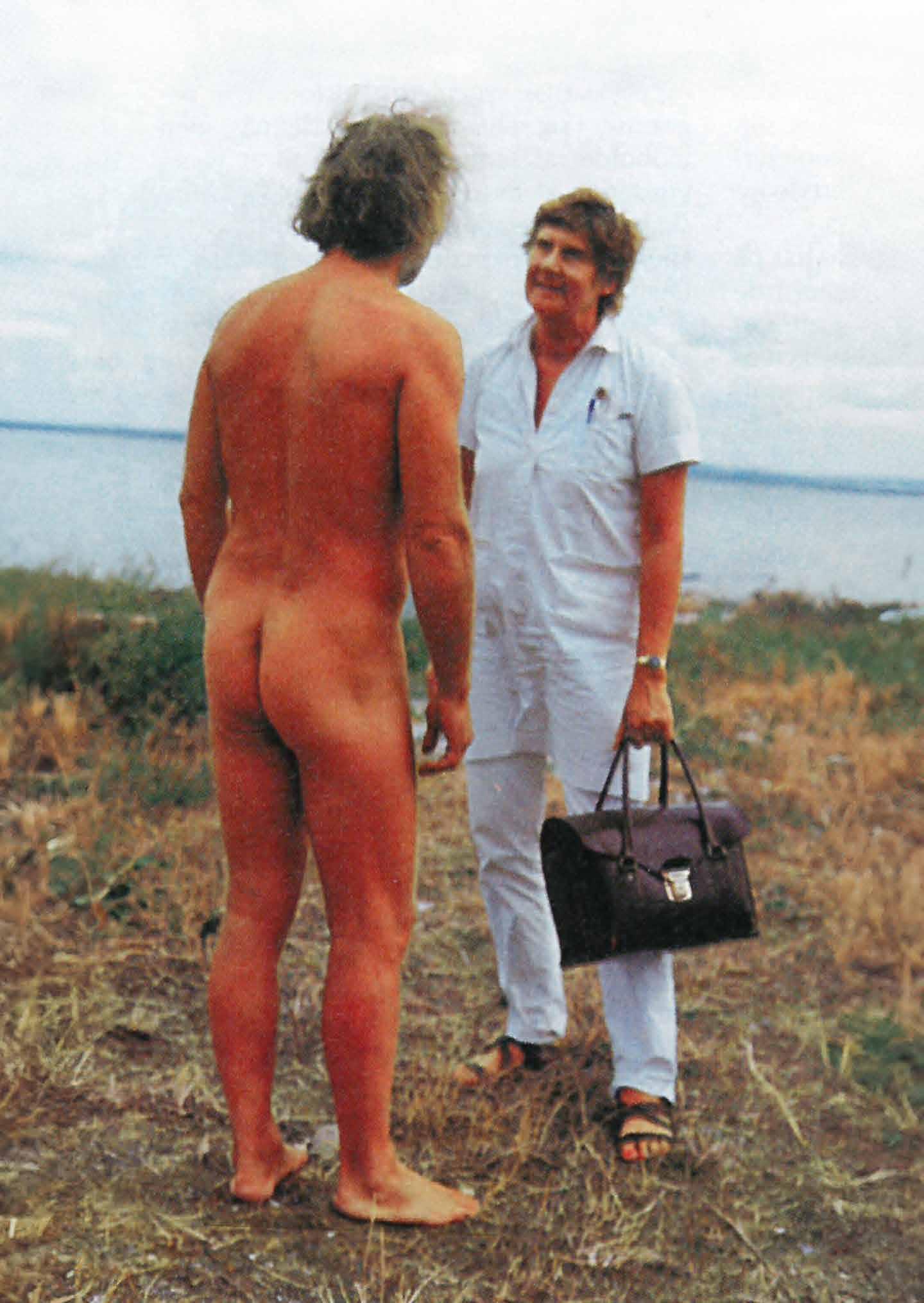Dagen efter kigger jeg ud i ø-lejren for at se til patienten. Efter nogen søgen får jeg øje på ham. Han er godt solbrændt, og ikke en centimeter af hans krop er skjult for mig. Jeg står der i min tækkelige sygeplejeuniform og hvide cowboybukser og fører en lang samtale med denne stenaldermand, hvis eneste påklædning er en ring i det ene øre og et hæfteplaster over det ene øje; men det er bare i orden.