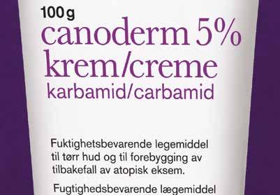 Canoderm 5% creme (carbamid) OTC. ATC: D02AE01. Indikationer: Fugtighedsbevarende behandling af tør hud af forskellige årsager og til forebyggelse af tilbagefald af atopisk eksem. Pakningsstørrelser: 100 g og 210 g tube, 500 g pumpeflaske. Dosering: Fugtighedsbevarende behandnling af tør hud af forskellige årsager: Cremen påføres efter behov, gerne flere gange dagligt og altid efter kontakt med vand. Forebygning af tilbagefald ved atopisk eksem. Cremen smøres ind mindst to gange dagligt og gerne efter kontakt med vand. Advarlser og forsigtigtighedsregler: Undgå at smøre i øjne/næse /ører/ åbne sår eller på slimhinder. Cremen kan give lokal forbigående svien og varmefølelse. Ansigtet er særligt følsomt. Kontraindikation: Overfølsomhed overfor de aktive ingredienser eller overfor nogle af hjælpesto erne. Dato for gennemgang af produktresumé 26.01.2021 | ACO Hud Nordic AB. www.perrigo.dk | MAT-6487, 2024-11.