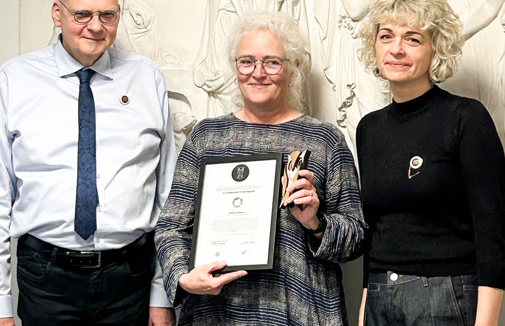 Annette Mollerup fik overrakt Athena Prisen af forkvinde i Dansk Sygeplejeråd, Dorthe Boe Danbjørg, og Jakob Thyssen Valerius, direktør i LB Foreningen.