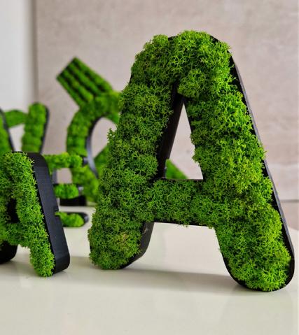 The sign is cut from 8 mm MDF and hand-covered with moss. Frame for sign is 3D printed and filled with reindeer moss. The backplate is made from 8 mm MDF with 45-degree beveled edges and is hand-covered with moss to create a floating effect.