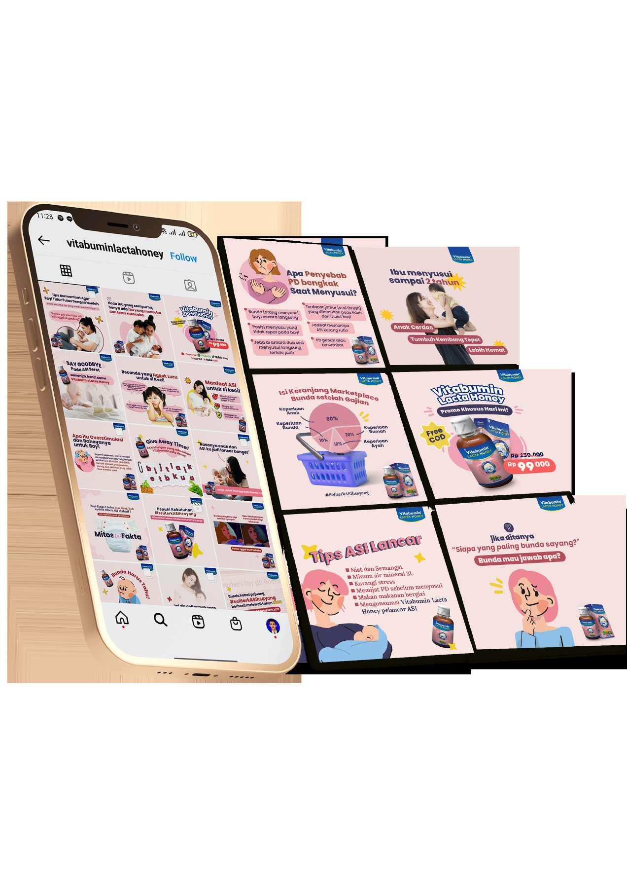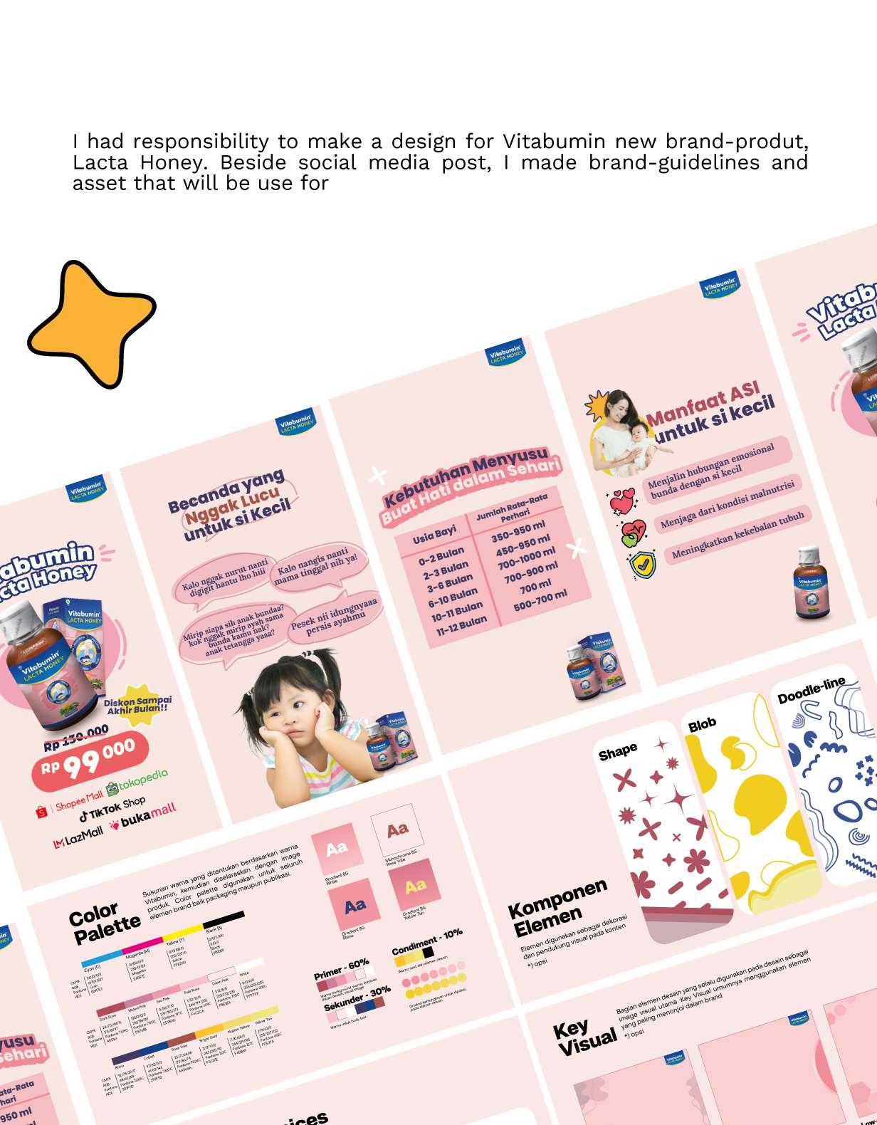 Vitabumin Lacta Honey is a new product focused on breastmilk booster. I was given responsibility to make brand design-guidelines including o cial color, social media templating and layouting, key visual, and assets that is will be used. Furthermore, I designed for Instagram daily post and another promotion stu refering to editorial plan from creative planner.