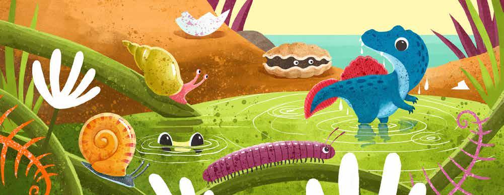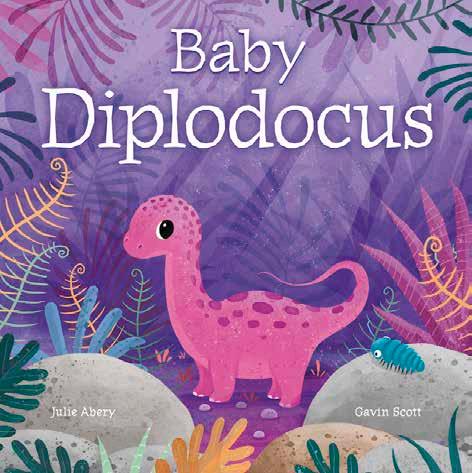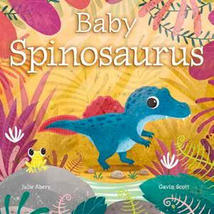 Baby Spinosaurus hatches and explores the prehistoric world. Wading in the river to find food, she gets stuck chasing a fish, but Mama is there to help. Lyrical rhyming text written by former preschool teacher Julie Abery is infused with Gavin Scott’s warm illustrations depicting the Cretaceous era, creating a delightful read for caregivers to share with babies and toddlers. The sturdy board book binding will hold up to countless readings.