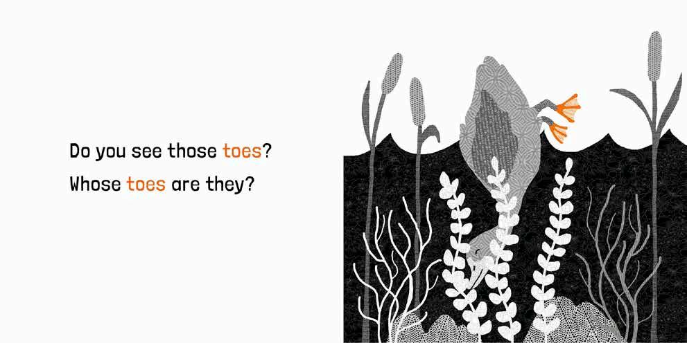 In this charming board book for the youngest of future readers, author-illustrator Kristina Jones uses textured black-and-white art to show familiar farm animals—plus a surprise at the end! Each spread poses a question, and the answer is revealed in a peek-a-boo style when the page is turned. The high-contrast art helps babies focus, and spots of color highlight toes. A great baby shower gift for new parents to read with their little ones.