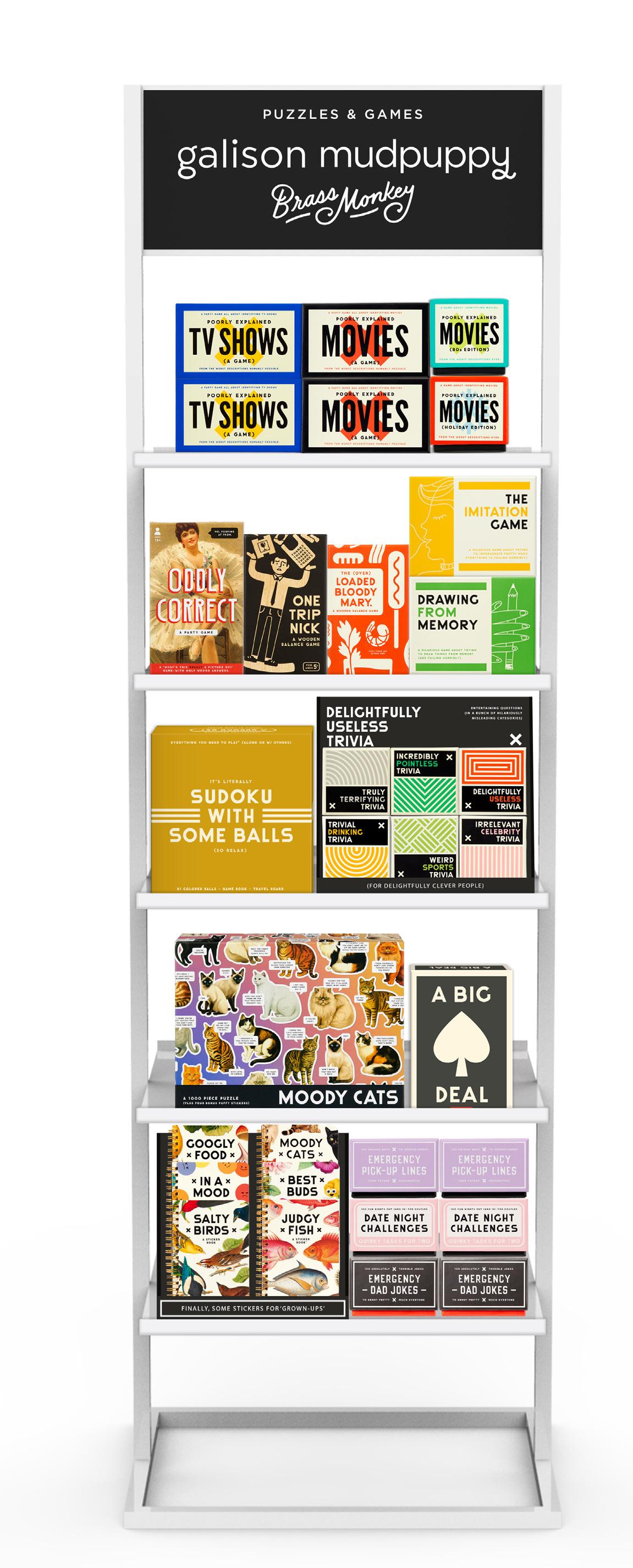 Our well-designed rack is the perfect solution to showcase approx 70-80 Brass Monkey units. And this white powder coated metal shelving tower provides for a wide assortment of product that can be merchandised from both sides.