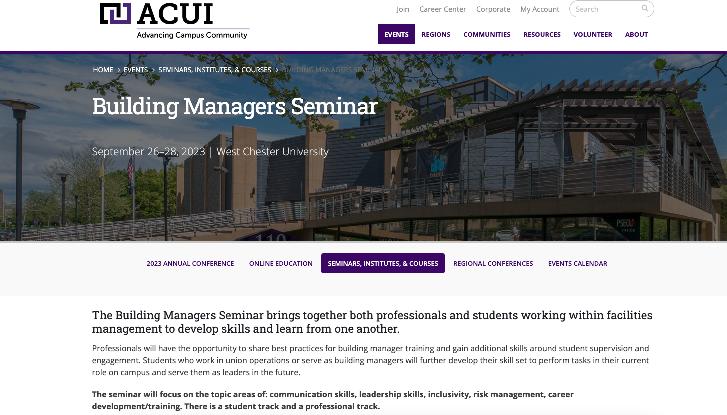 Sykes Union and Student Activities hosted the Association of College Unions International’s (ACUI) Building Manager Seminar on September 26-28, 2023. The seminar brings together both professionals and students working within facilities management to develop skills and learn from one another.