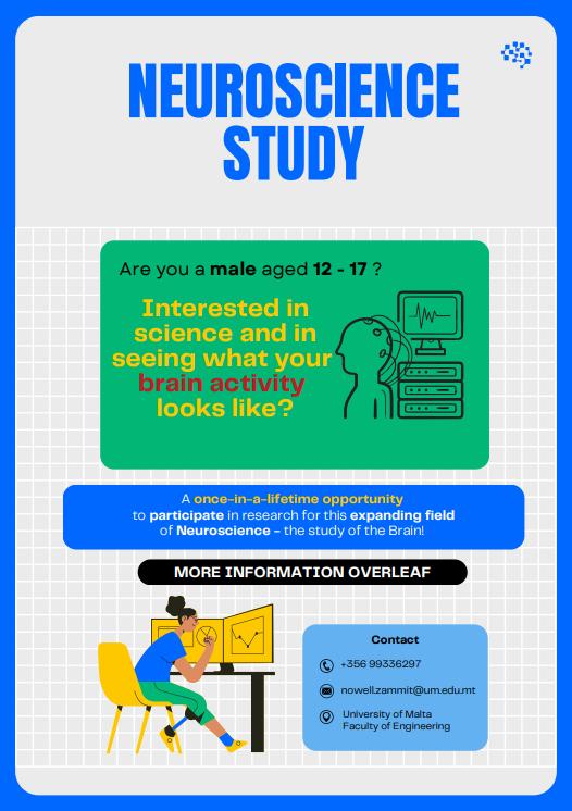 Mr Borg, who is being supervised by Prof Richard Muscat and Dr Nowell Zammit, is inviting your children to participate in one EEG session. “Participation is voluntary, and it is entirely you and your child's choice to join. You do not need to decide immediately and can discuss this invitation with others before making your decision” said Mr Borg.