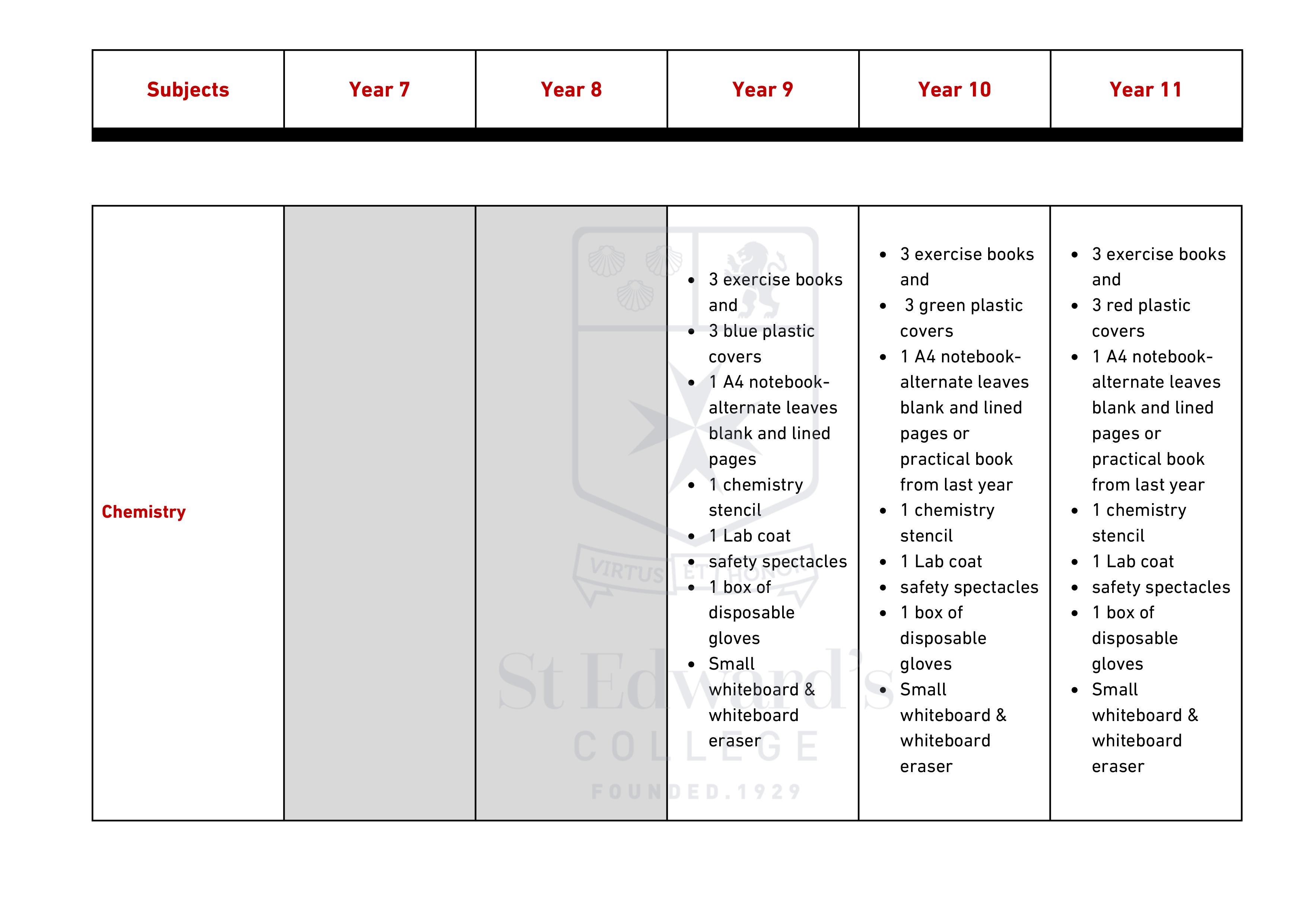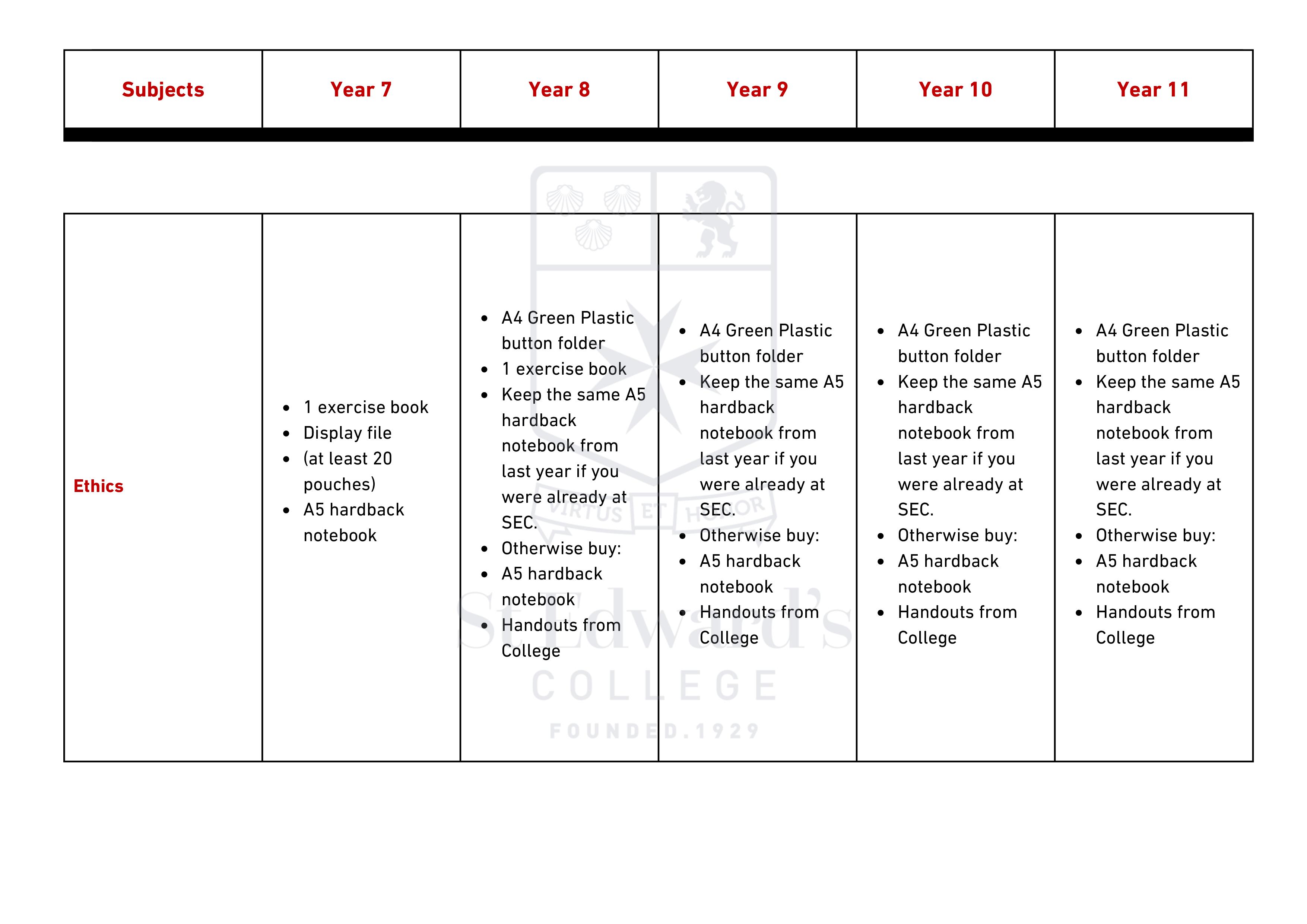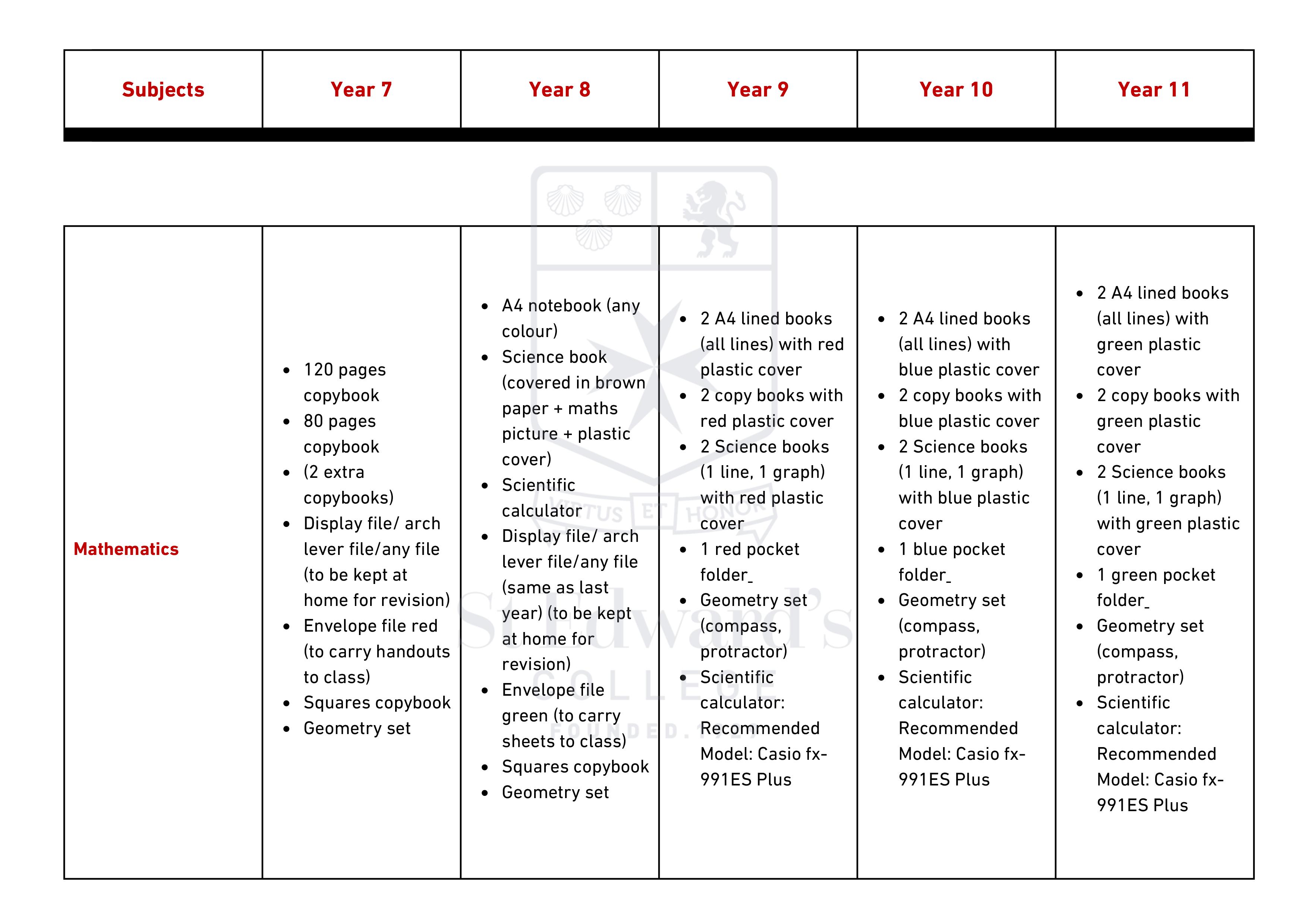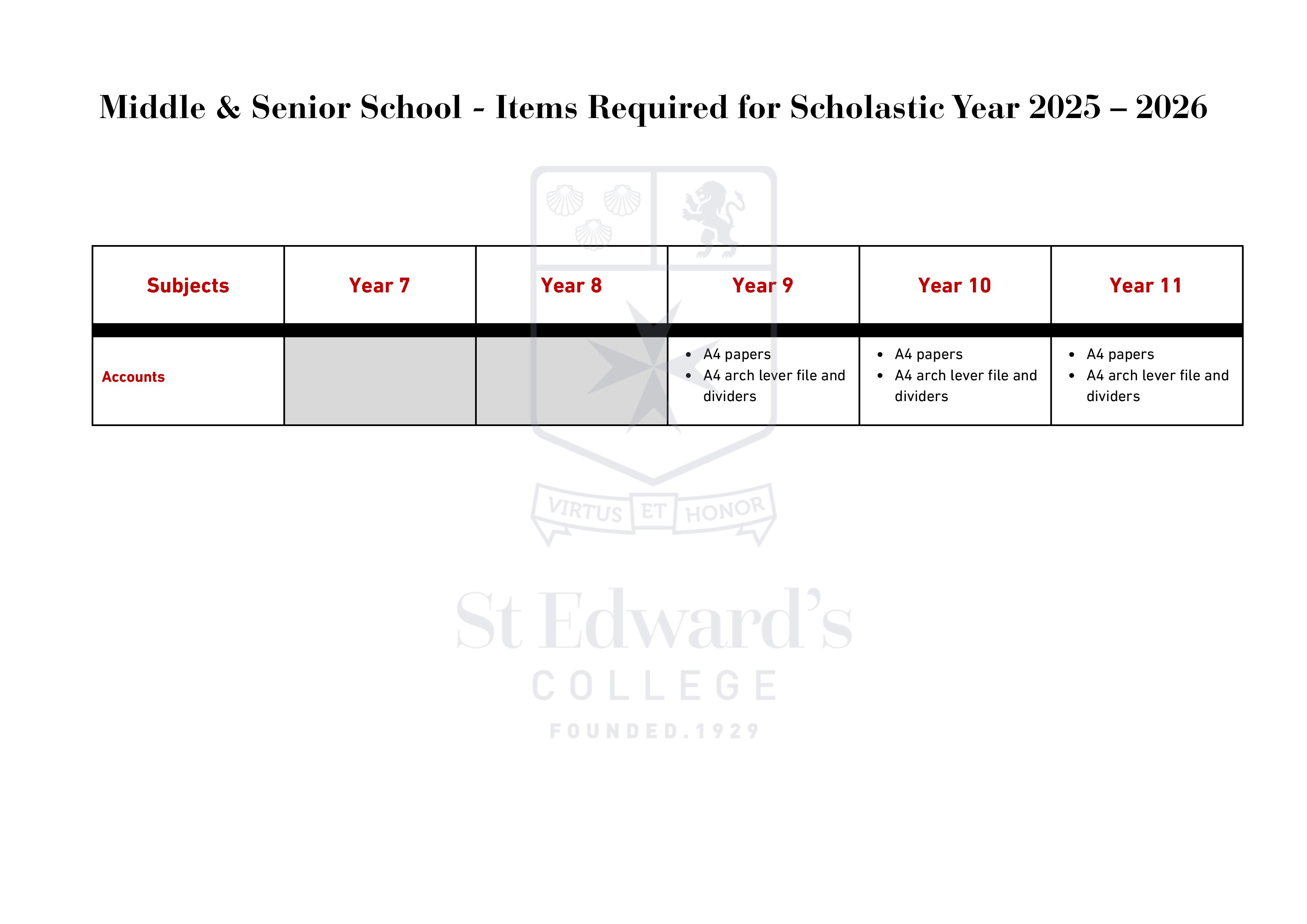 Middle & Senior School - Items Required for Scholastic Year 2025 – 2026