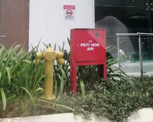 External fire hydrant is an active fire protection measure with the water source provided from the public water service. The fire hydrant system supplies water with sufficient pressure to be delivered through pipes throughout the building to the valve network. The system consists of the water tank, suction piping, fire pumps, and distributed piping system. During a fire emergency, the firefighters will attach a hose reel to the hydrant. It can also be attached to the fire engine to boost the water pressure using an engine pump. The fire hydrant must be in good and working condition with unobstructed access.