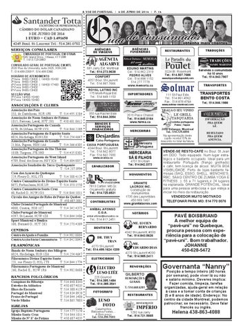 Associação dos Pais 333, de Castelneau, H2R 1P8 T.: 514.495.3284 Associação de Nossa Senhora de Fátima 1815, Favreau, Laval, H7T 2H1 T.: 450.681.0612 Associação Portuguesa do Canadá 4170, St-Urbain, H2W 1V3 T.: 514.844.2269 Associação Portuguesa do Espírito Santo 6024, Hochelaga, H1N 1X6 T.: 514.254.4647 Associação Portuguesa de Lasalle 2136A, Pigeon, H8N 1A6 T.: 514.366.6305 Associação Portuguesa de Ste-Thérèse 103B, Turgeon, J7E 3H8 T.: 514.435.0301 Associação Portuguesa do West Island 4789, Boul. des Sources, H8Y 3C6 T.:514.684.0857 Associação Saudades da Terra Quebequente T.: 514.237.3994 Casa dos Açores do Quebeque 229, Fleury O., H3L 1T8 T.: 514.388.4129 Centro Comunitário do Divino Espírito Santo 8672, Forbin Jason, H1K 2J9 T.: 514.353.1550 Centro Comunitário Santa Cruz 60, Rachel O., H2W 1G3 T.: 514.844.1011 Circulo dos Amigos de Rabo de Peixe do Quebec T.: 450.687.2082 Clube Oriental Português de Montreal 4000, Coutrai, H3S 1C2 T.:514.342.4373 Clube Portugal de Montreal 4397, St-Lauent, H2W 1Z8 T.:514.844.1406 Sport Montreal e Benfica 100, Bernard O., H2T 2K1 T.:514.273.4389