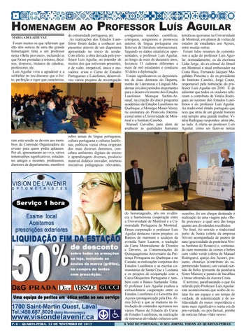 temáticas açorianas na Universidade de Montreal, em planos de visitas de estudos de estudantes aos Açores, entre muitas outras. Foram lidos resumos de comentários à ação do professor Luís Aguilar, nomeadamente, os da escritora Lídia Jorge, do ex-cônsul do Brasil em Montreal e atual embaixador na Costa Rica, Fernando Jacques Magalhães Pimenta e do ex-presidente do Instituto Camões, Jorge Couto, responsável pela nomeação do professor Luís Aguilar em 2000. É de salientar que todos os oradores referiram o contributo de Vitália Rodrigues ao sucesso dos Estudos Lusófonos e do professor Luís Aguilar. Ao tradicional ditado português que reza que atrás de um grande homem está sempre uma grande mulher, Vitália Rodrigues respondeu: atrás não, ao lado. A oferta ao professor Luís Aguilar, como sói fazer-se nestas