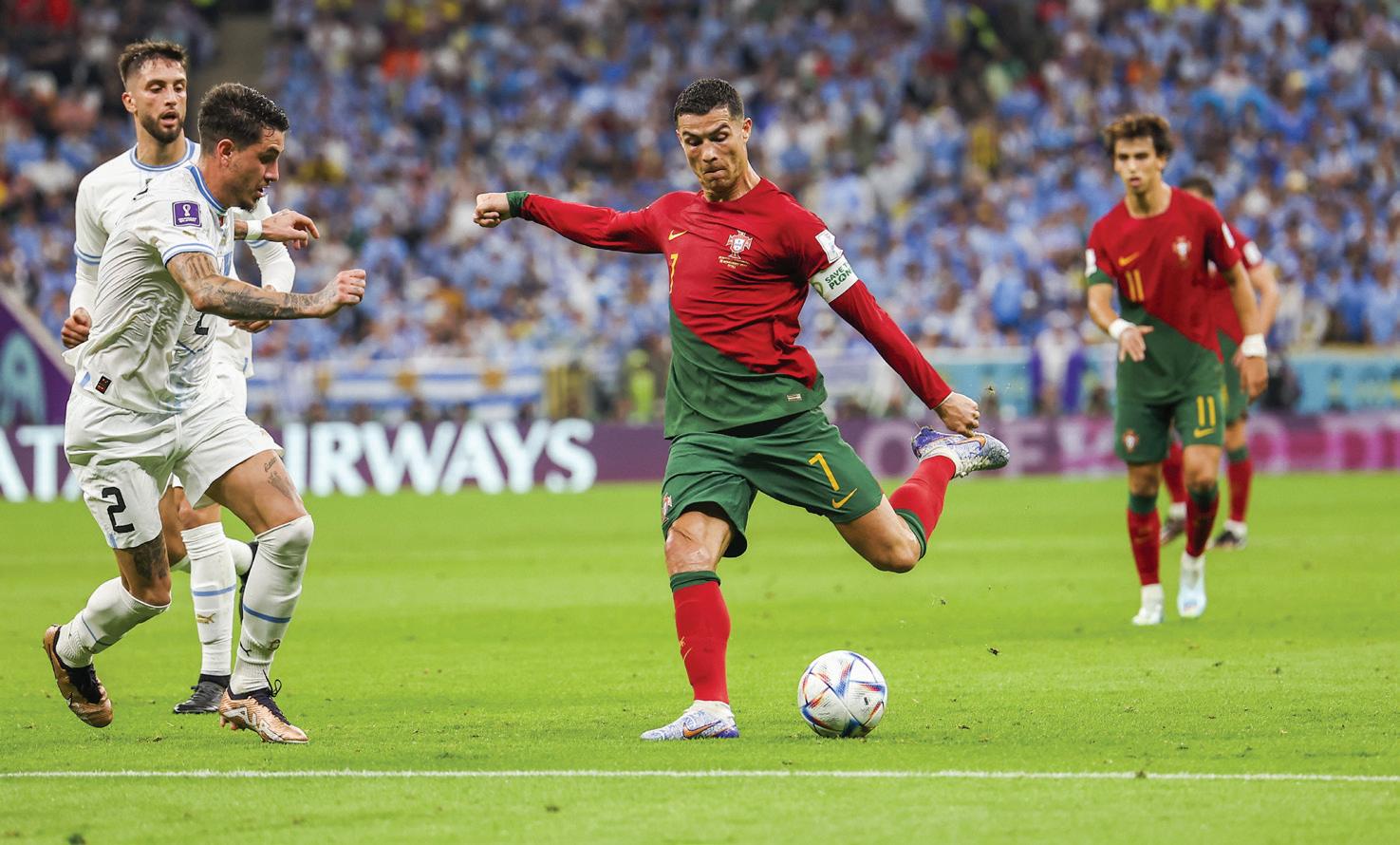 O maiato foi o comandante do triunfo luso e Portugal bem pode partir à des coberta do mundo, ali, junto às areias do deserto, bem perto de onde outrora chegaram destemidos navegadores. Tudo começou com uma primeira par te amarrada como um nó de marinhei ro. Portugal fez o dobro dos remates (94) e dos passes (340-155), mas não era fácil encontrar caminhos para a baliza do Uruguai. A «celeste» teve a melhor oportunidade antes do intervalo, quan do, aos 32m, Bentancur rompeu e só não marcou porque encontrou o muro Diogo Costa pela frente.