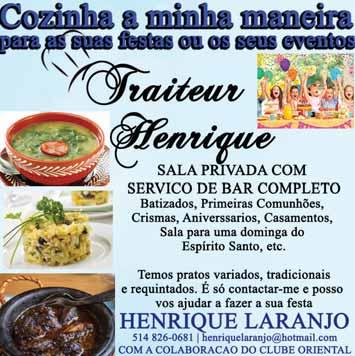 O Clube Oriental está de volta, no sábado, 22 de abril pelas 19h30 a nossa festa tradicional, Baile da Pinha com bons prémios para os concorentes, e música a cargo Paulo Nascimento e o seu DJ vinde de Otava. A ementa será, sopa, salada, prato principal Arroz Terra e Mar, sobremesa e café. As ementas são confecionados pelo Mestre Henrique Laranjo. Para reservas: 514-342-4373 ou 514-434-7238.