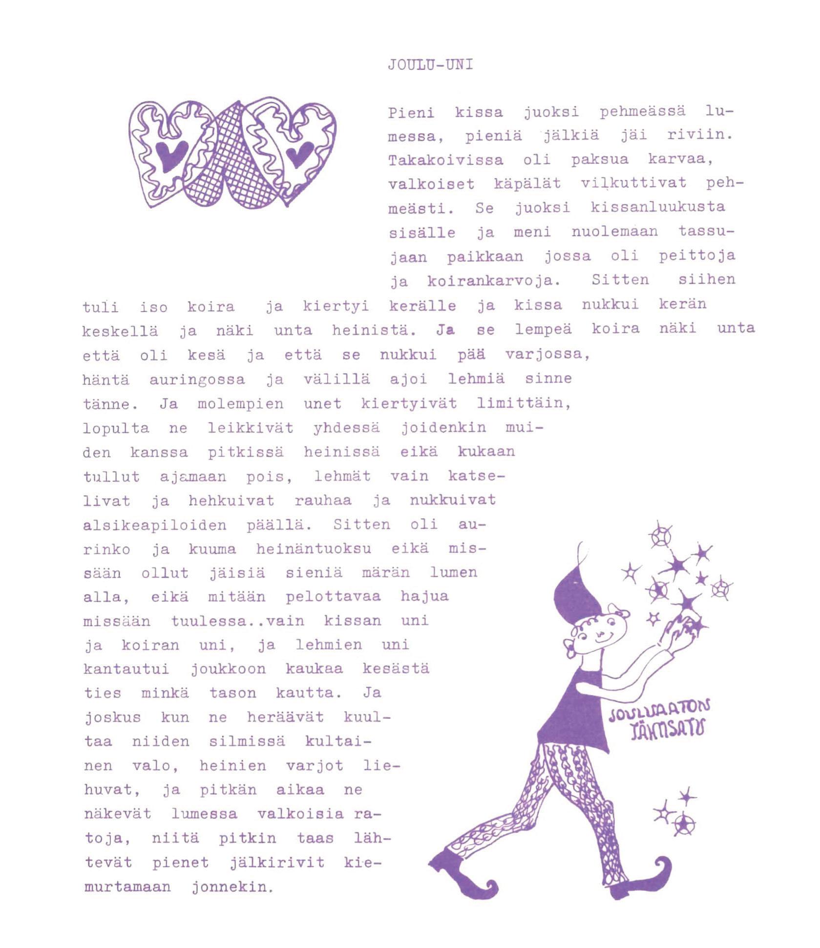 Aukeaman kuvat on julkaistu alunperin Symbiontissa vuonna 1968. Viereisen sivun sympaattisen sienikartan on laatinut nimimerkki ’Ritu’, todennäköisimmin lehden toimittaja ja kuvittaja Ritva Kivikkokangas. Kivikkokangas on piirtänyt myös tämän sivun kuvat, mutta lämpöisen ja unenomaisen tarinan kirjoittaja ei ole tiedossa. Sienikartta julkaistu syksyn numerossa ja Joulu-uni joulun numerossa.