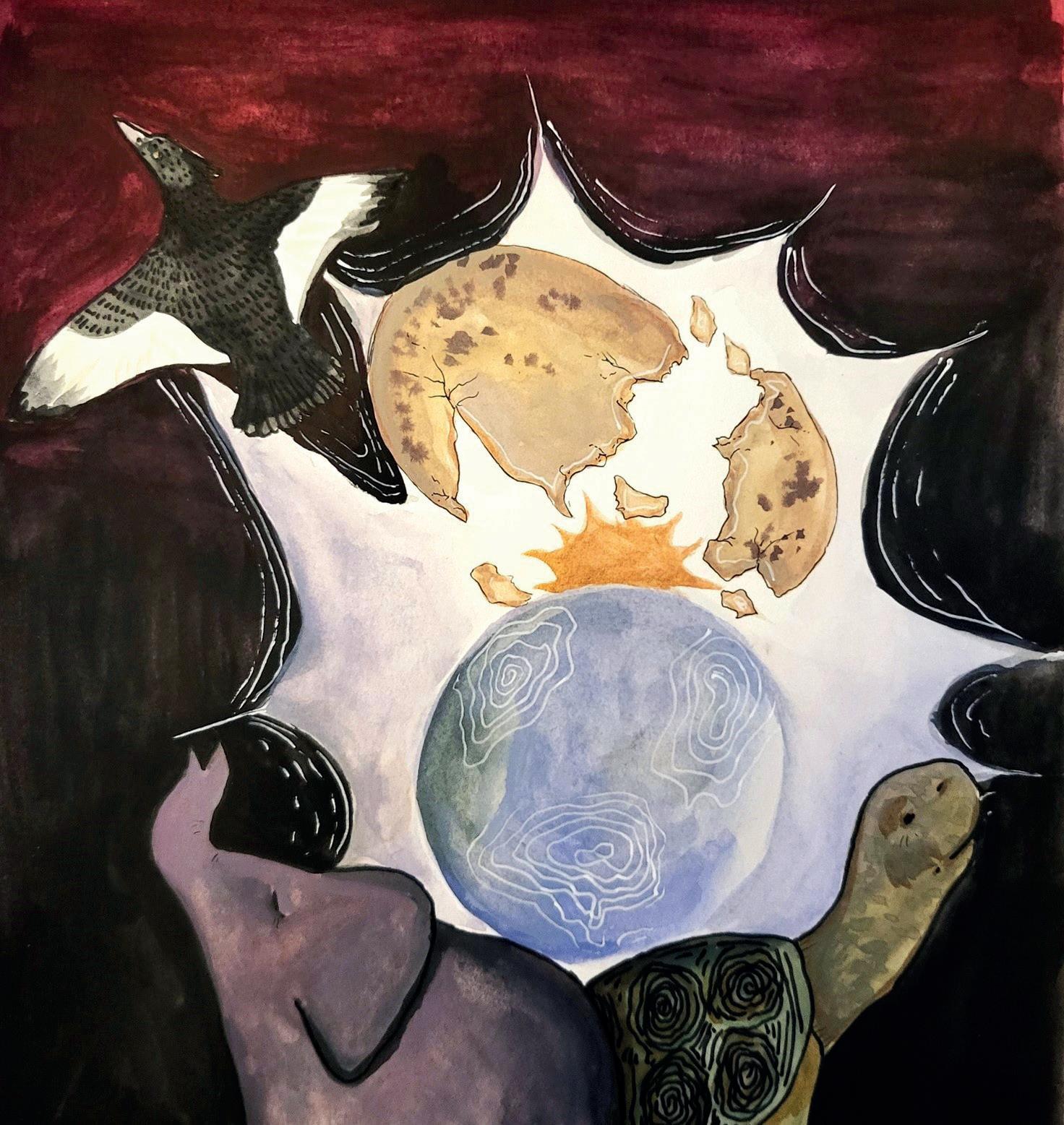 Ihmiskunnan ammoisista ajoista asti meitä on kiinnostanut se, millainen maailmamme on ja mistä se on tullut. Monet erilaiset myyttiset maailmankuvat ja -syntytarinat selittivät maailmanjärjestystä ennen luonnontieteiden aikakautta, Pale blue dot -valokuvaa, alkuräjähdysteoriaa ja maailmankaikkeuden laajenemisen toteamista. Myyttien kehittäjät ovat eläneet keskellä luontoa ja kokeneet itsensä luonnon osiksi ehkä enemmän kuin nykyihmiset. Nämä luomiskertomukset ja maailmankuvat siis sisältävätkin monia luonnollisia motiiveja, kuten munia, kasveja ja erilaisia eläimiä, jotka kannattelevat maailmaa koossa.