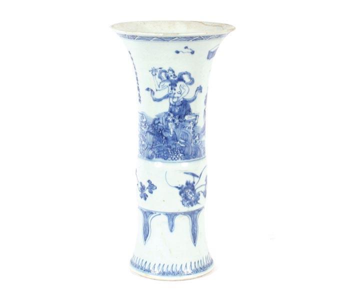 A Chinese blue and white Gu shaped vase, decorated figures, rocky landscapes and script, 38cm high AF – SoLd for £3,800.