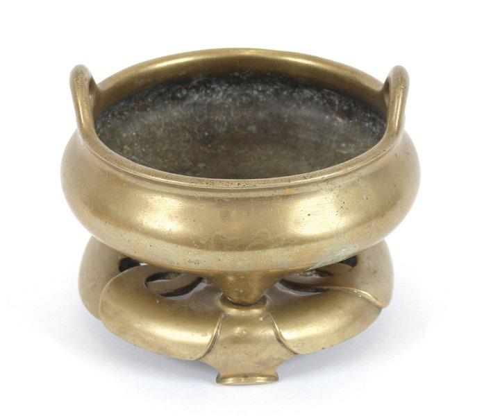 A Chinese bronze censer, having loop handles, raised on three squat pointed feet, seal mark to base, 18cm dia., raised on a matching circular pierced stand, 14cm high overall – SoLd for £20,000.