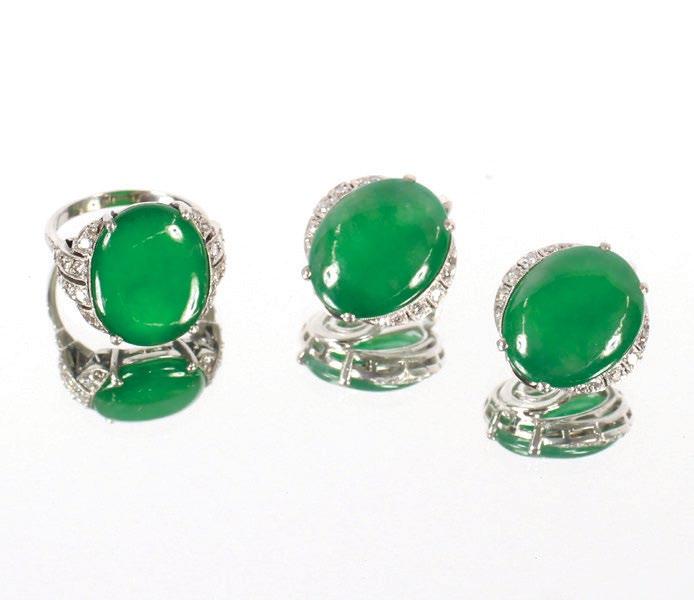 A white metal, jade and diamond set ring, size N, approx. 7.5gms total weight; and a pair of white metal jade and diamond set ear-rings approx. 15gms total weight –SoLd for £3,600.