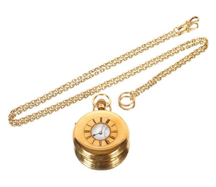 A 18ct gold half hunter pocket watch, the white enamel dial inscribed “Barrie, Edinburgh No.1223” approx. total weight 128.83gms, and an 18ct gold 20” watch chain, 53cm total length, approx. 33.5gms –SoLd for £3,500.